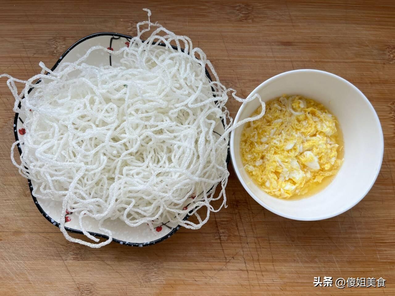 2、準備一下把龍口粉絲,沖洗一下表面晾乾水分,然後放在熱油鍋內炸一下,粉絲瞬間炸透,緊接着撈出來控油,避免粉絲炸糊。鍋裏留有滴油,炒2個雞蛋碎備用。