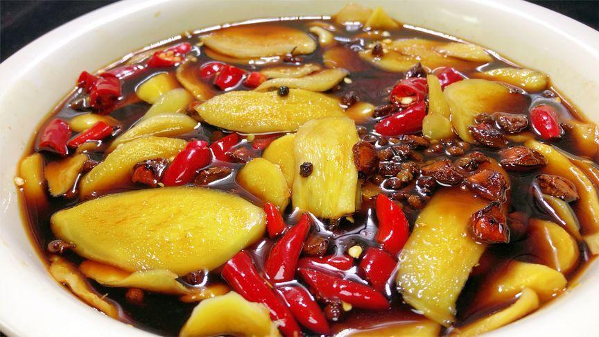 3、把晾涼的料汁倒入裝有薑片的容器中,確保料汁沒過薑片。再放上幾個小米椒,放入冰箱冷藏三天,一道美味的醃生薑就大功告成,直接食用即可。
