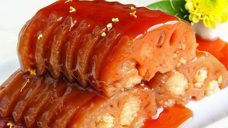 2、鍋裏放入冰糖,炒出焦黃色。倒入大量的水,放入蓮藕。下紅棗、枸杞和紅糖,大火煮開轉小火。煲1個半小時,稍放涼後切片擺入盤中,淋上湯汁即可。