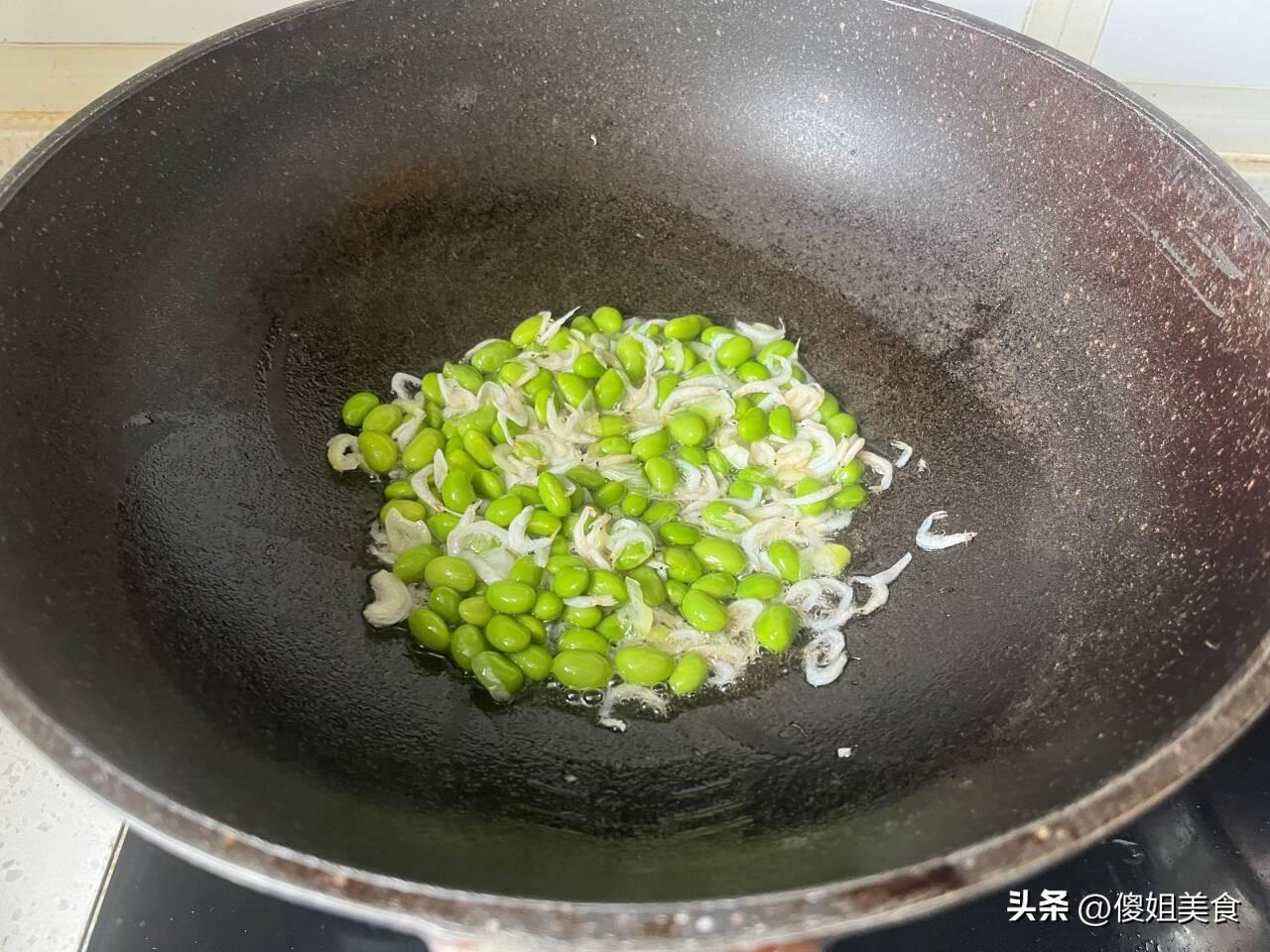 4、炒鍋中放入少許的食用油(煮湯不要放太多的油),油熱把蔥花丟入鍋中炒香,隨後把鮮蝦皮、毛豆都放入鍋中,用木鏟不停的翻炒,把蝦皮和毛豆炒至變色即可。
