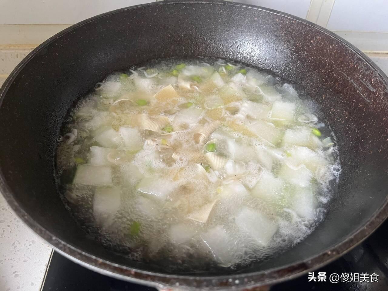 5、沿着鍋邊淋入適量的清水,大火煮開後把千張也放進去,接下里往裏面撒少許胡椒粉、鹽調味,大火煮沸騰後轉成中火煮,大概煮10分鐘左右,把冬瓜煮軟爛就可以。也要注意冬瓜不要煮太長時間,煮好的湯滴2滴香油攪均勻,家裏每個人盛一小碗。咕嘟咕嘟一鍋燉,湯和菜都有了、足夠鮮爽,好喝又開胃。