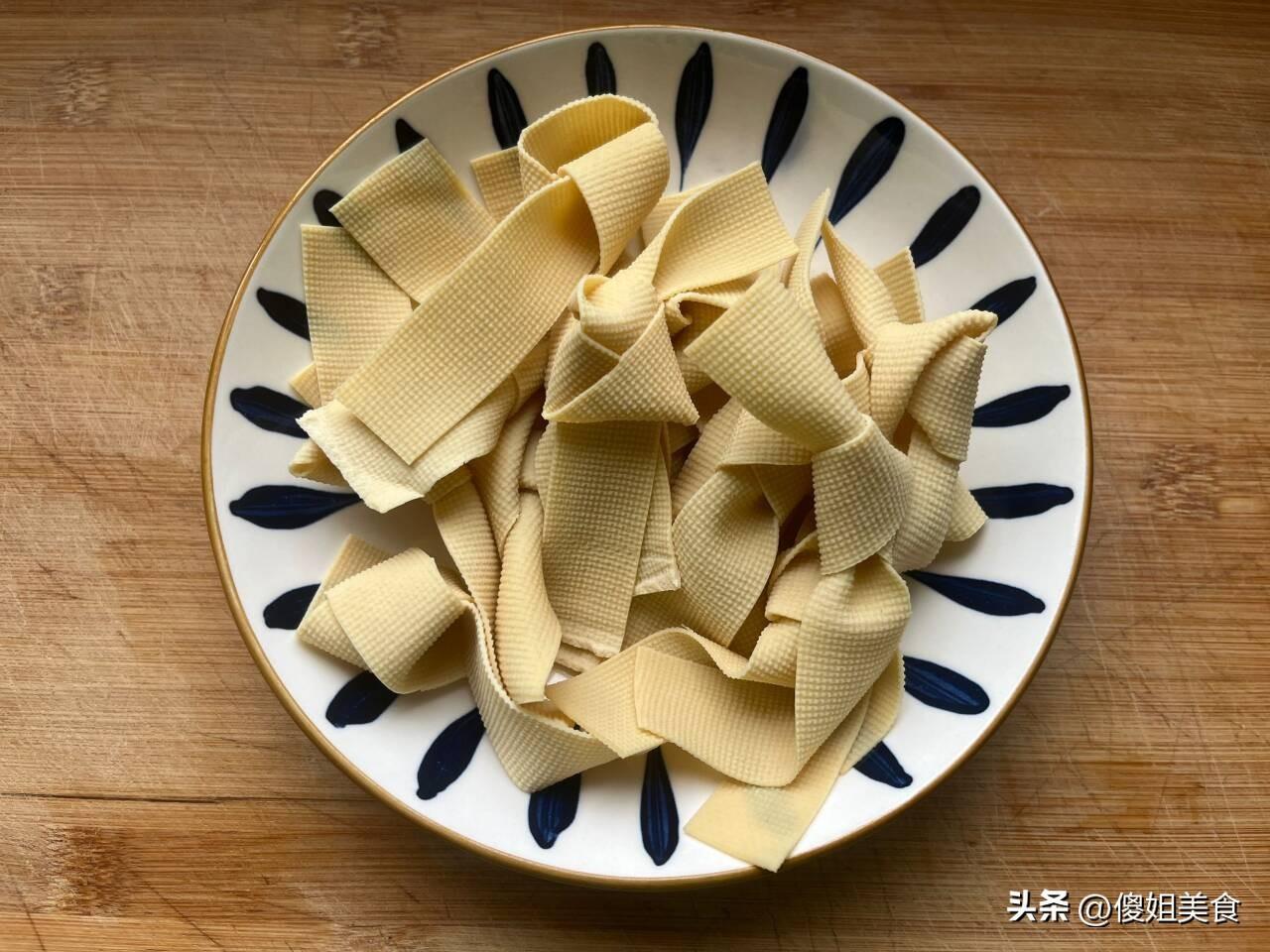 2、花3塊錢買了一張千張,買回來的千張切成寬長條,然後像系蝴蝶結一樣把千張繫好。最後把千張倒入開水鍋中煮一下,去除裏面的豆腥味。