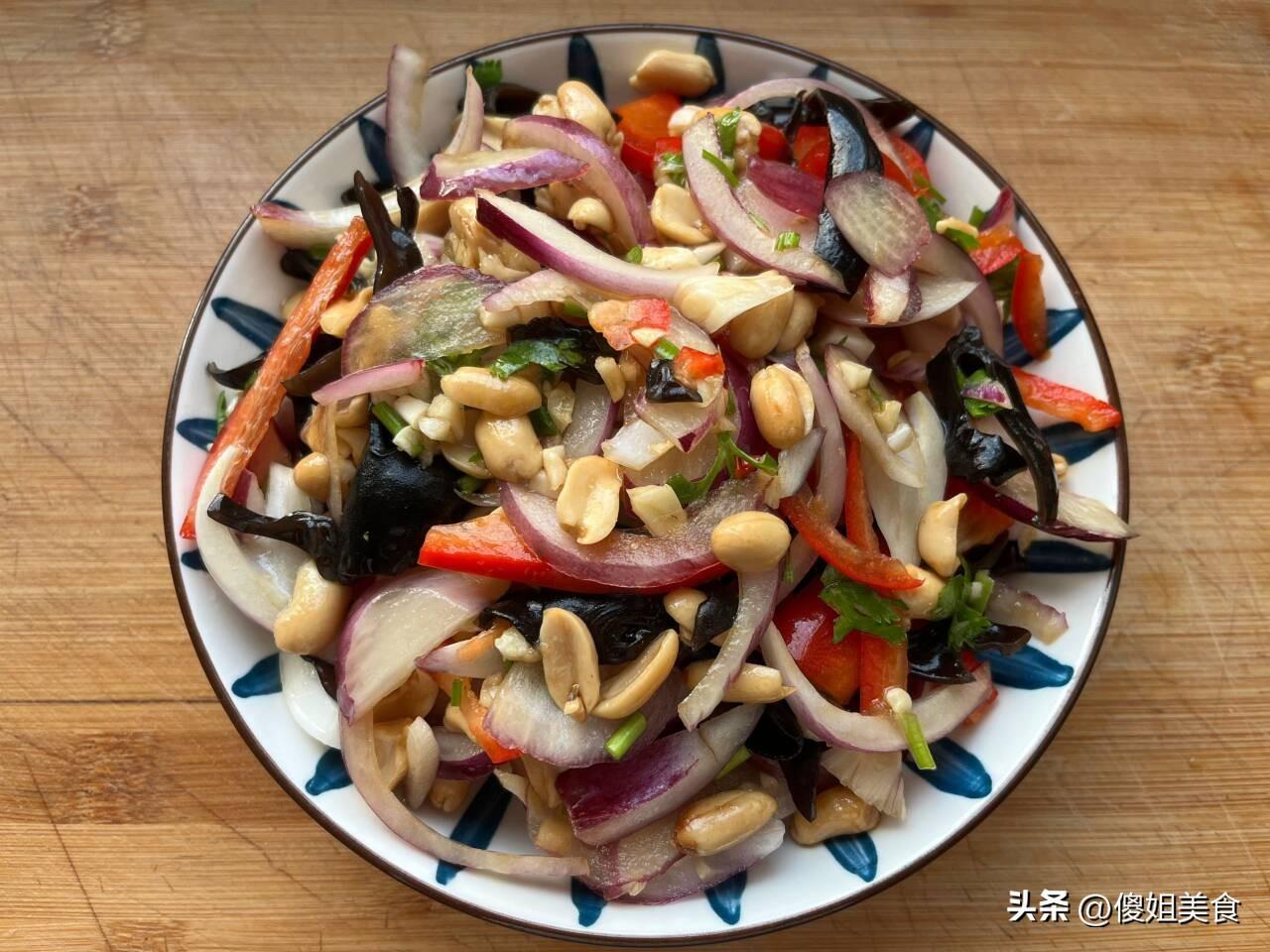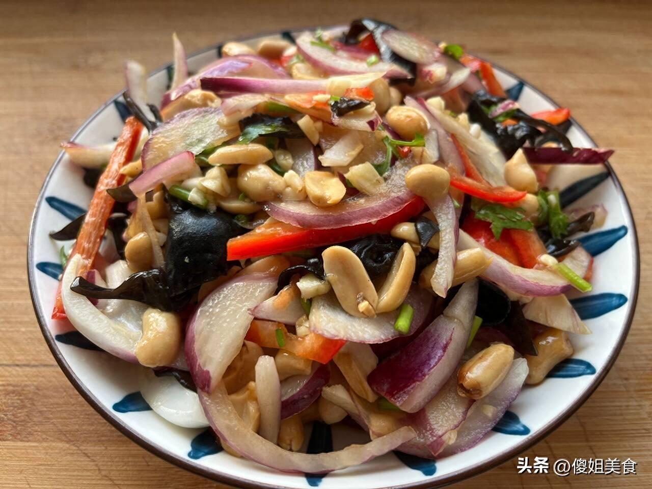 【涼拌洋蔥】 所準備的食材有:洋蔥一個、木耳適量、花生米少許、紅椒、陳醋、白糖、味極鮮、大蒜、蠔油、香菜