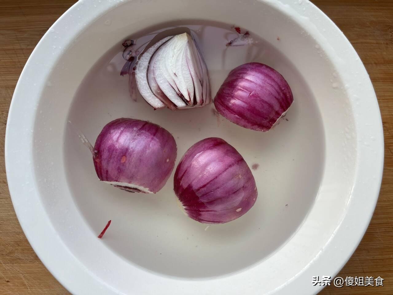 具體做法:1、洋蔥分爲紫皮和白皮,我喜歡喫紫皮洋蔥,洋蔥性溫,味辛甘,適量的喫一些洋蔥能夠美容養顏、殺菌以及促進消化。洋蔥喫起來辛辣,而且在切洋蔥的時候也特別的辣眼睛,爲了避免辣眼睛,切洋蔥的時候可以把洋蔥切成小塊放在清水中泡一會,這樣可以減少洋蔥的辣味。最後把浸泡好的洋蔥切成細長條,放入盤子內備用即可。