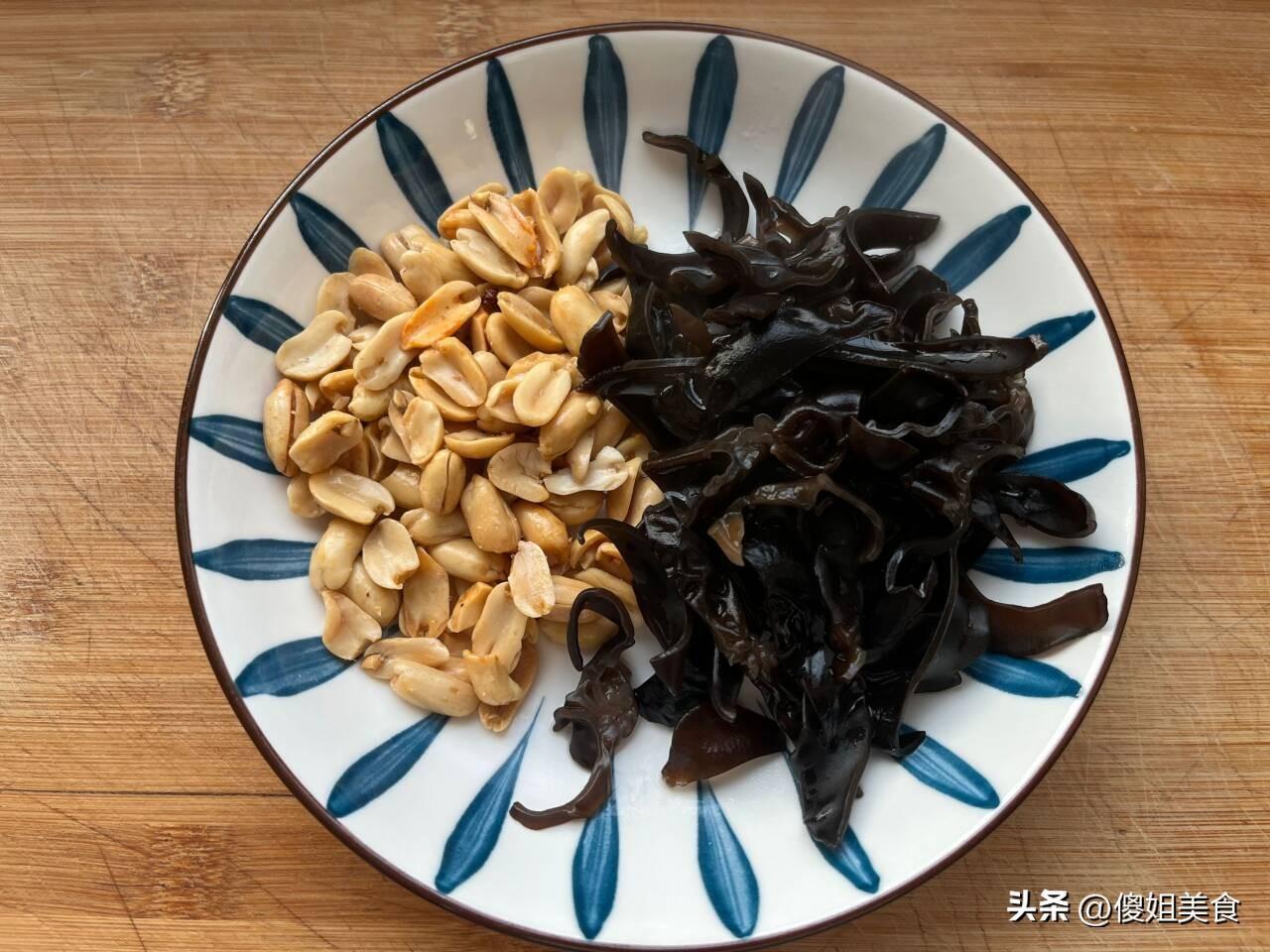 2、油炸花生米也是拌涼菜的靈魂,天忒熱我沒有自己炸,就買了點縣城的,每次自己炸的時候也容易炸糊。再準備幾朵幹木耳用冷水浸泡好,泡好後清洗乾淨,改刀切成長條,最後用開水煮一下木耳,把木耳煮熟撈出來控水就可以。