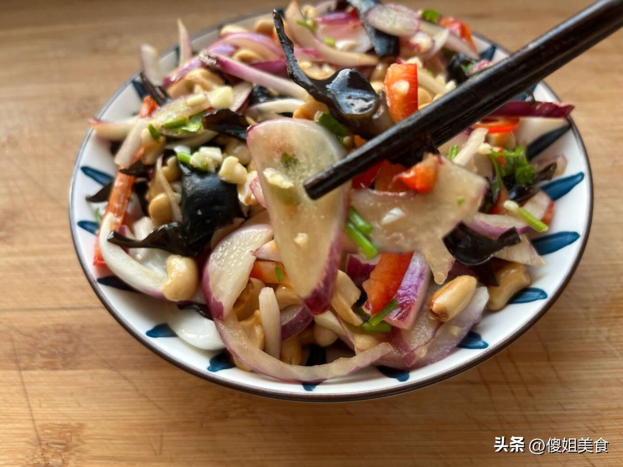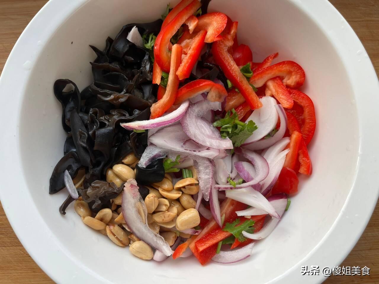 3、切好的洋蔥段、紅椒段、木耳、花生米都都放在一塊,喜歡喫香菜的可以來點香菜,接下來就是放調料品,放點白糖提鮮、2勺陳醋、1勺蠔油、少許味極鮮、香油和鹽,雙手戴上一次性手套充分的抓拌均勻,讓所有食材入味,口感更好喫些。