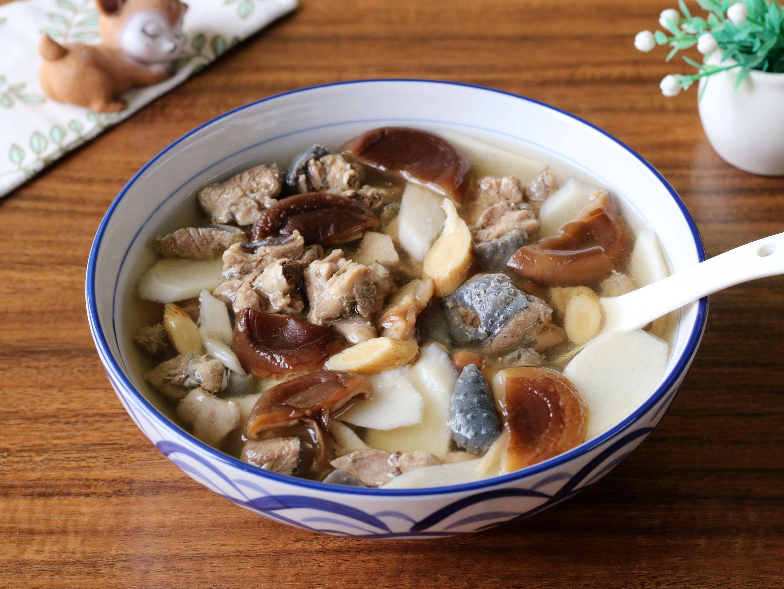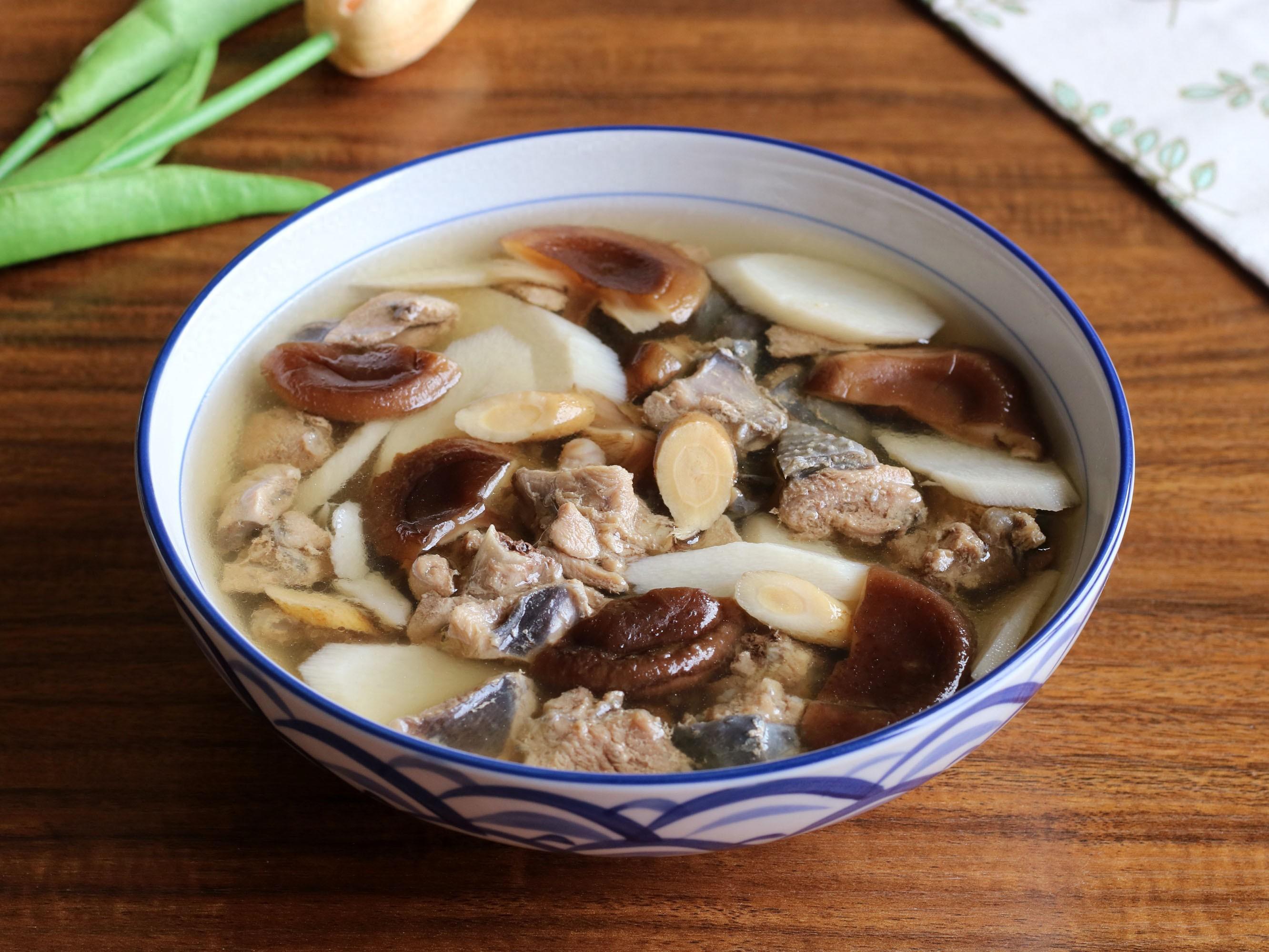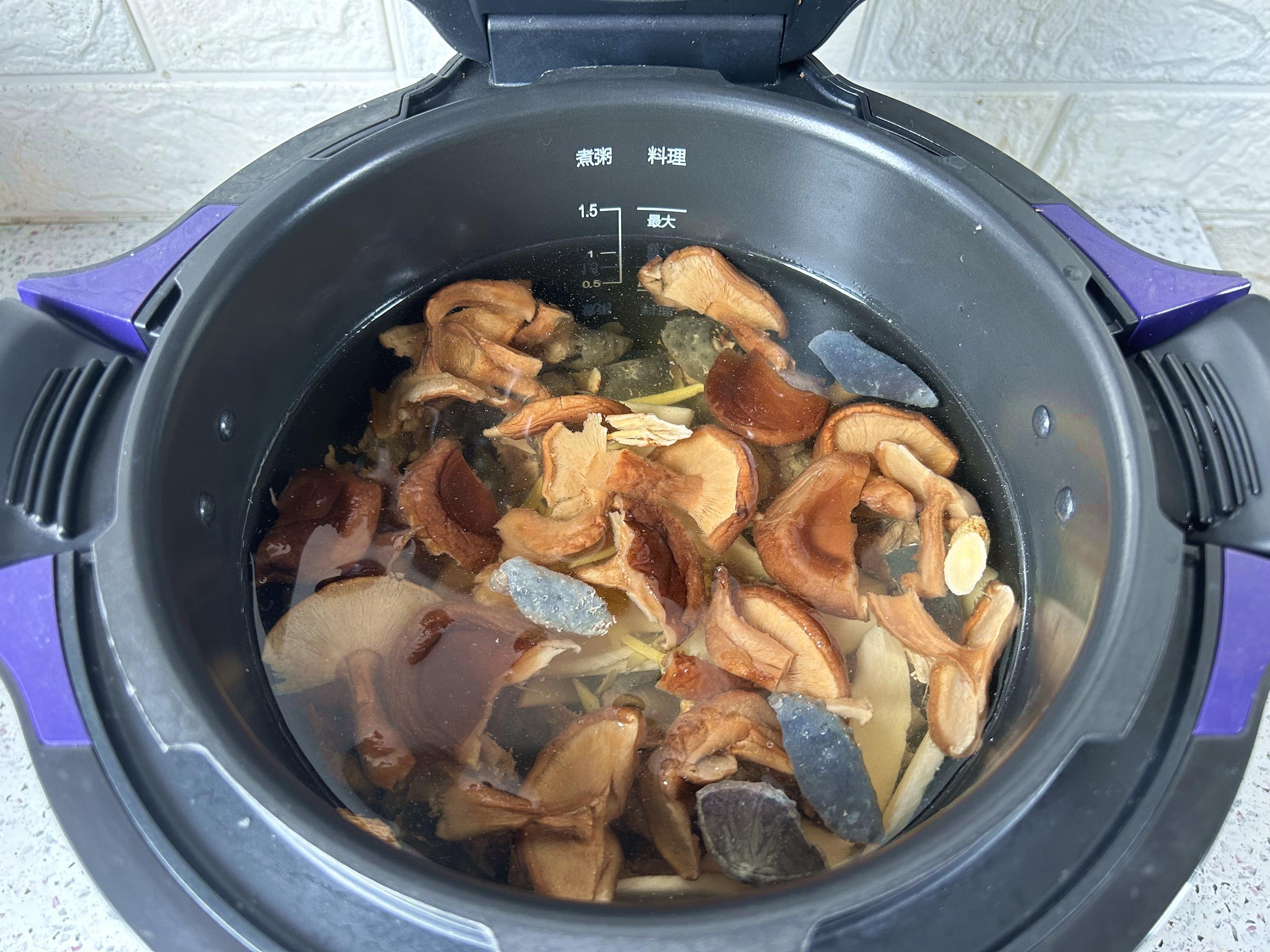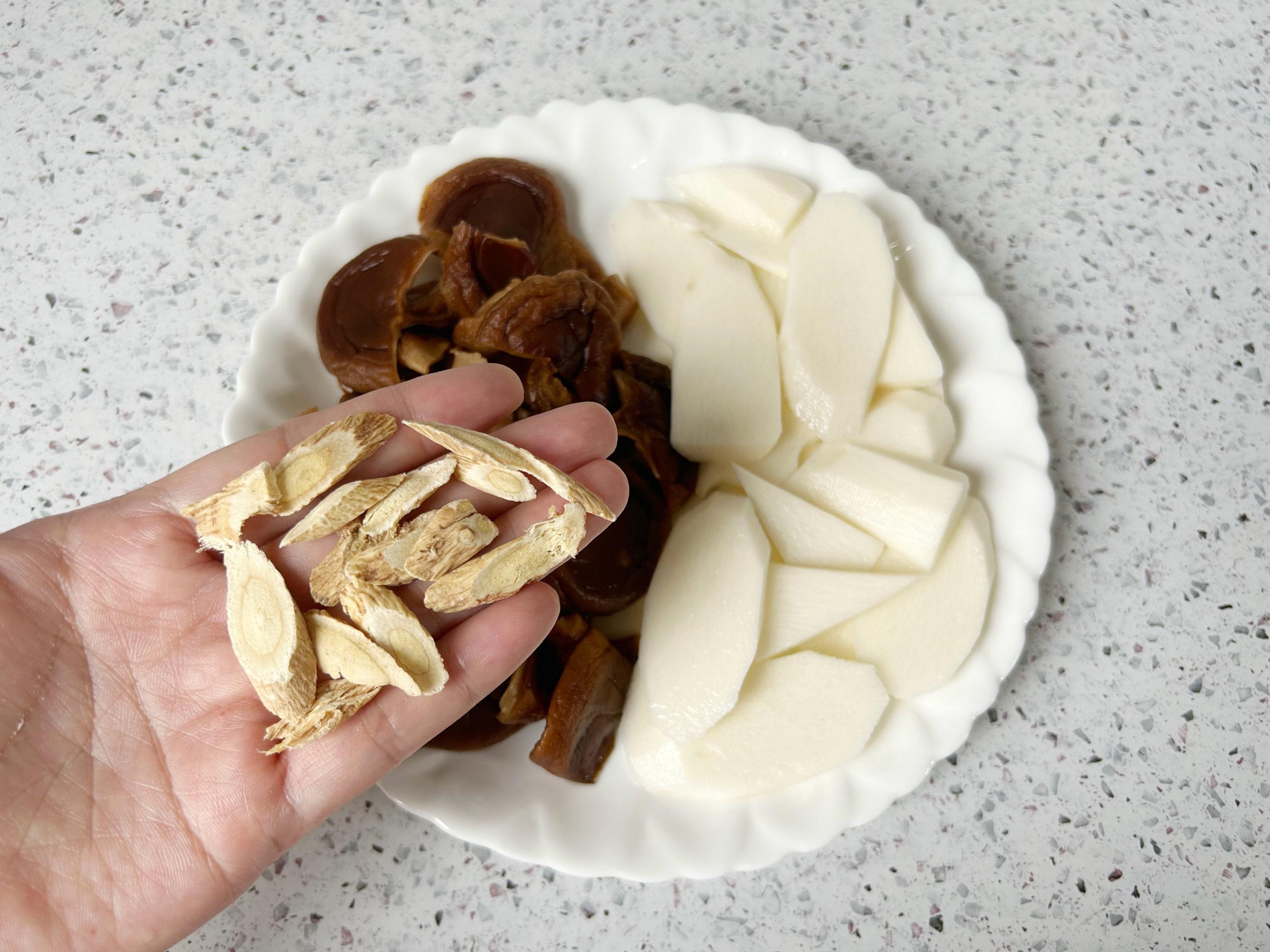 幹香菇加水泡發,清洗乾淨,比較大朵的香菇撕成2-3瓣,鐵棍山藥去皮,斜着切成薄片,黃芪用水簡單沖洗一下,生薑去皮切絲。