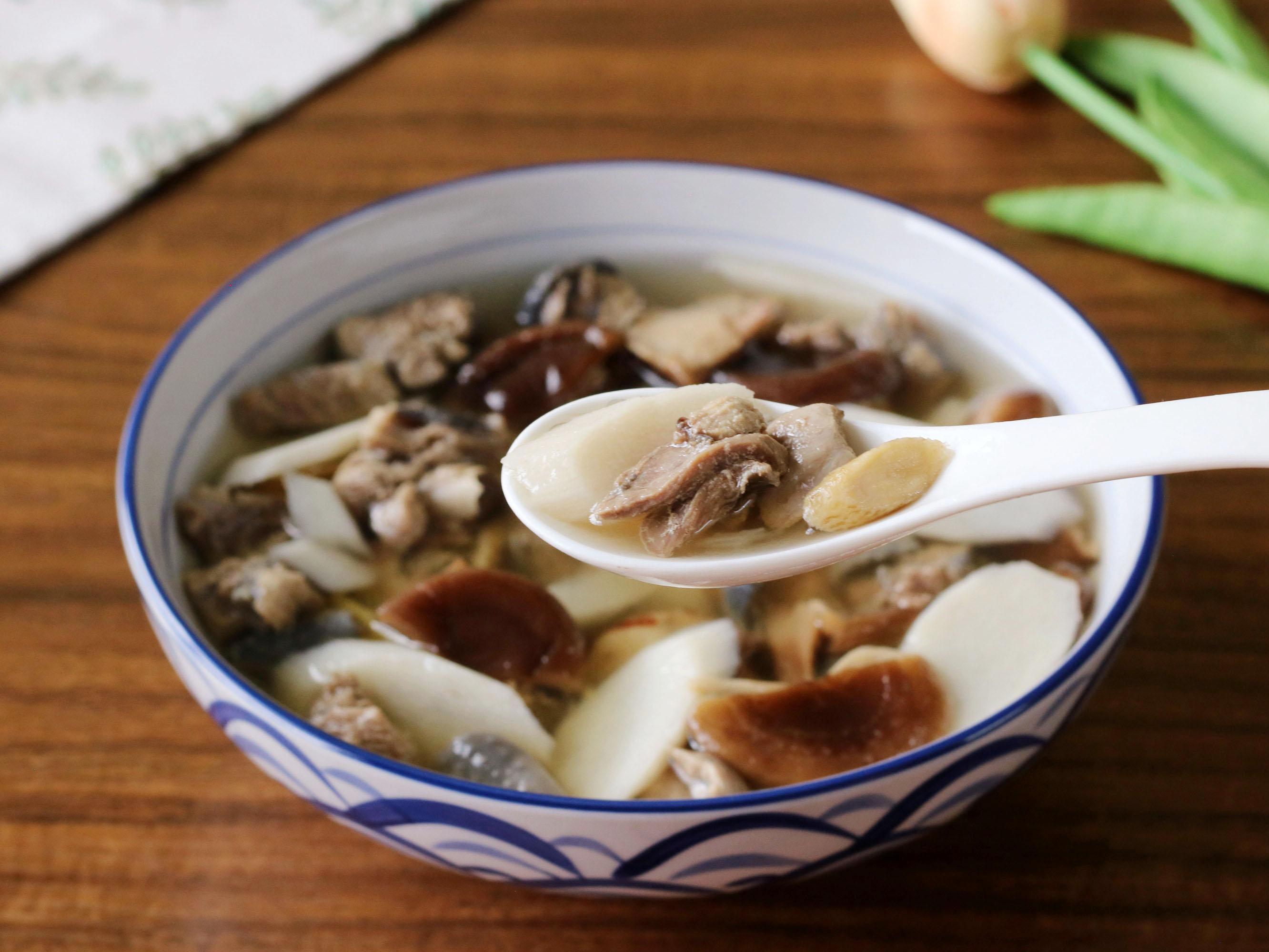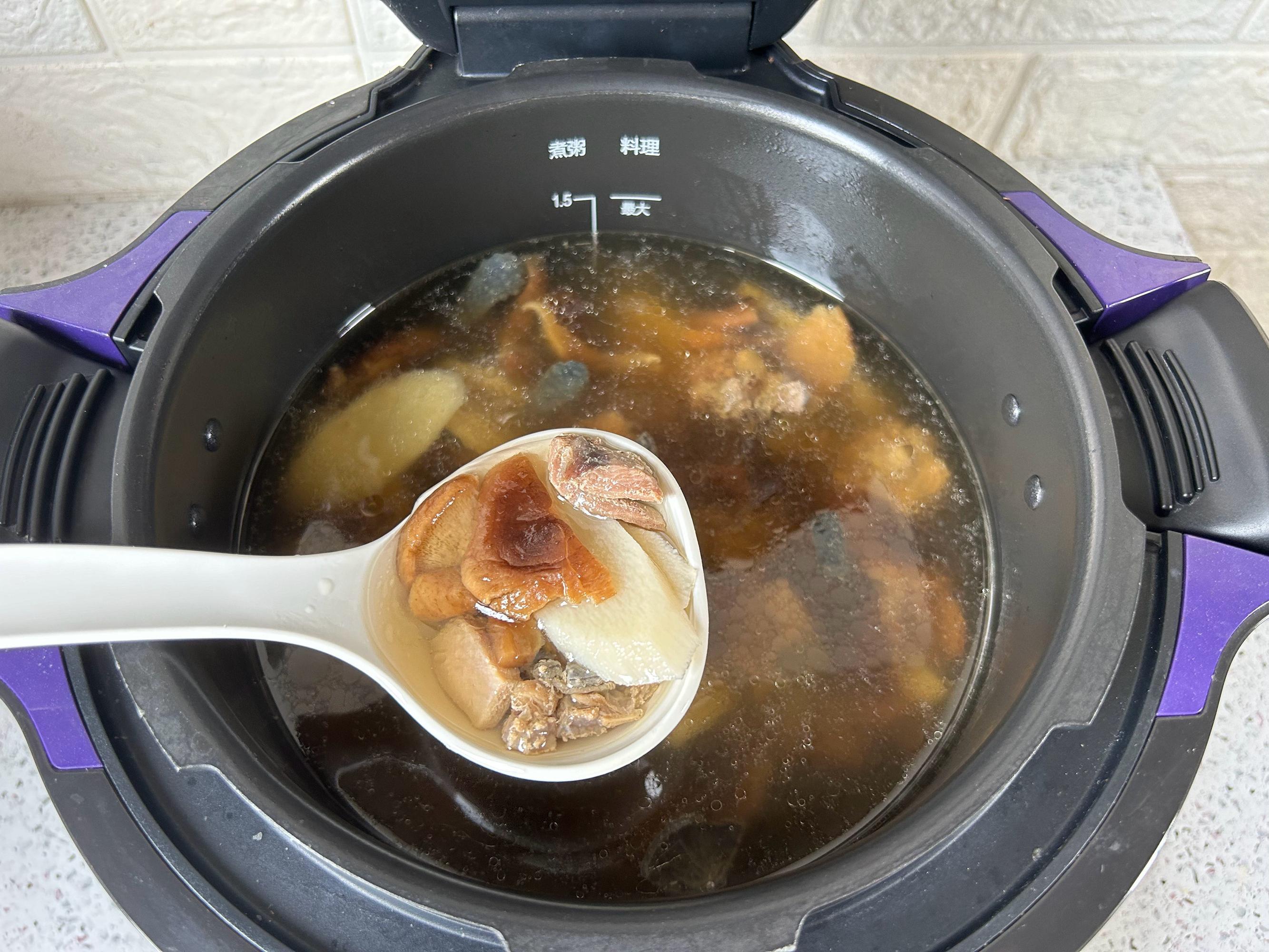 25分鐘後,煲湯完成,加適量的鹽調味,攪拌到鹽融化。一道營養好喝,補氣又養脾胃的山藥香菇烏雞湯就做好了。