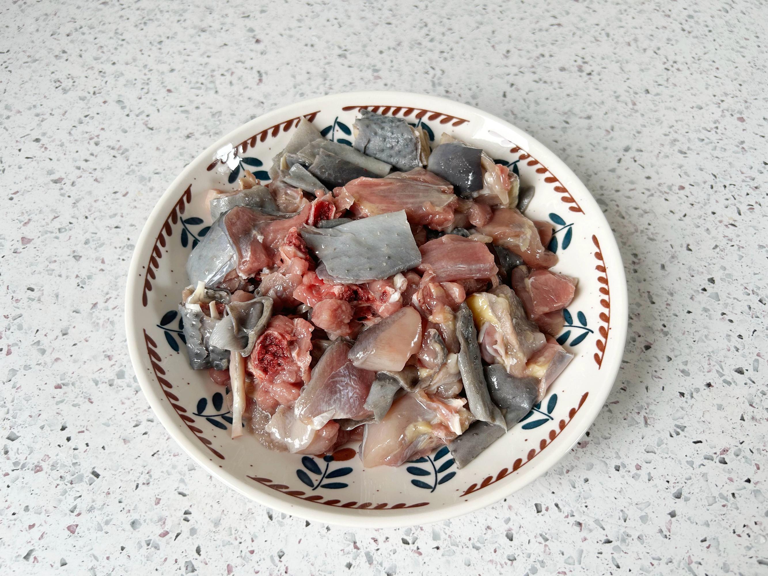 烏雞冷水進鍋,加入2大勺料酒,中火加熱,煮開後再煮5分鐘,撈出來清洗乾淨浮沫。