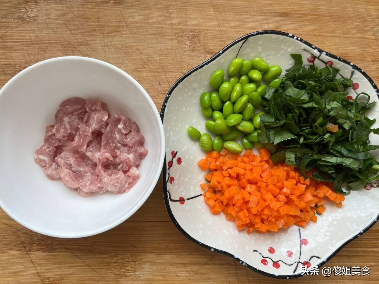 具體做法:1、老媽老爸可是勤快人,小菜園裏各種蔬菜都有,就連新鮮的毛豆自家都種了些,拔了幾棵新鮮毛豆,把裏面的豆粒取出來放入盤子內。接下來再準備適量的菠菜、胡蘿蔔,這些蔬菜都是在菜園裏拔的,賊新鮮,都洗乾淨後,菠菜切碎,胡蘿蔔切成小丁。最後再準備一小塊的豬瘦肉,洗乾淨後切成小丁,用澱粉抓一下,煮熟的肉丁滑嫩好喫。