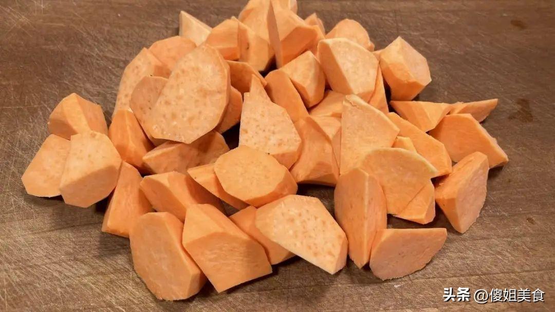 - 處理紅薯:首先,把紅薯洗淨,去皮,然後切成滾刀塊,塊的大小要適中,太小容易炸糊,太大則不易熟透。
