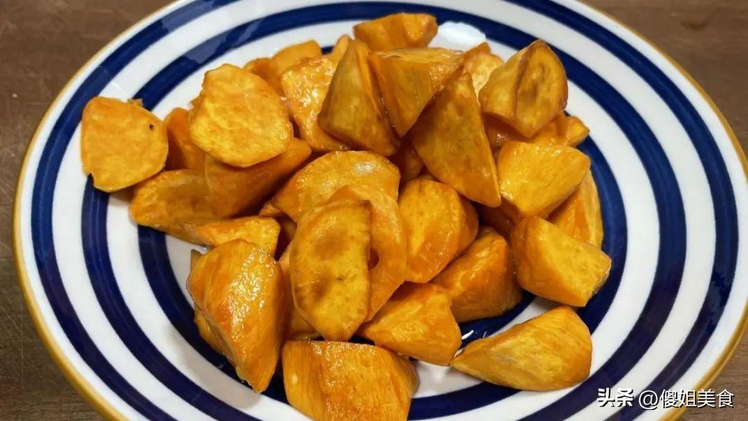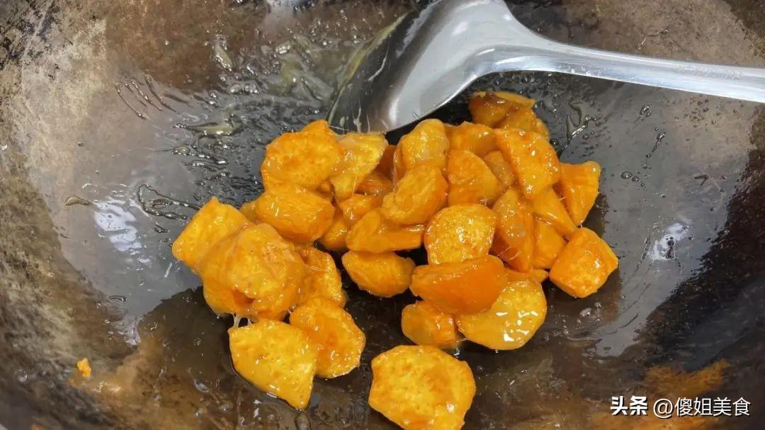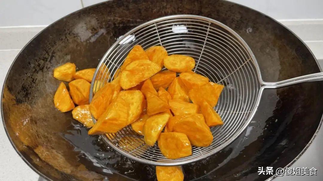 - 炸紅薯:在鍋裏倒入適量植物油,油溫升至六七成熱時,放入紅薯塊,慢慢炸至金黃色,撈出瀝乾油備用。炸紅薯的時候火候很重要,要注意控制油溫,不然紅薯塊容易炸得外焦裏生。