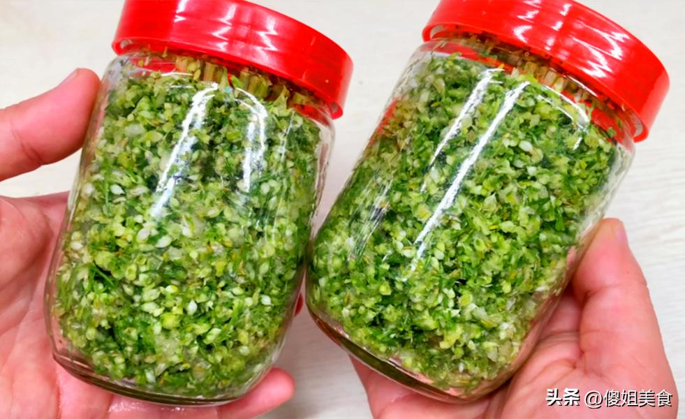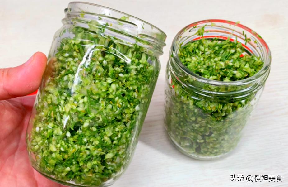 6、將拌勻的韭菜花醬裝入乾淨的玻璃瓶中,壓緊,封口後放入冰箱冷藏,時間越久,醬味兒越濃郁,口感也就越好,這樣製作的韭菜花醬可以保存數月之久,每次用餐時只需取出適量即可。