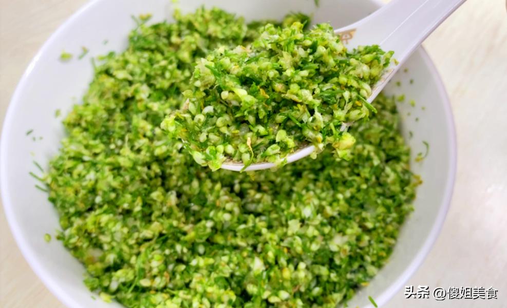 3、攪碎後倒入大碗中,陣陣清香味撲鼻,每年這個季節我媽都會做很多韭花醬,不光可以當蘸料,喫麪條加點或者喫饅頭抹上一層,別提多下飯了。