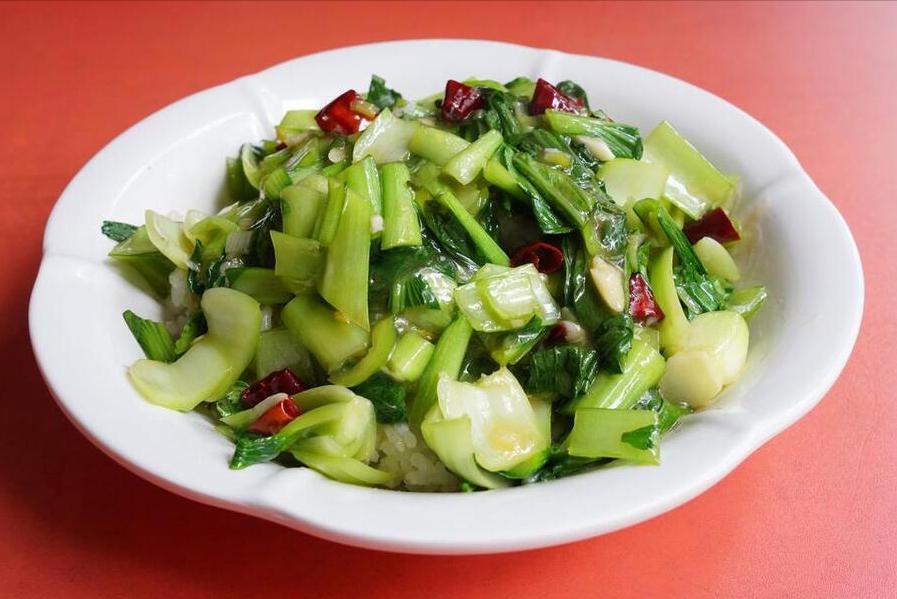 食材:小青菜、蒜蓉、幹辣椒、食鹽、味精、食用油