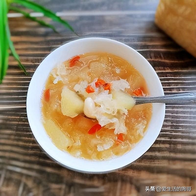推薦喫法,銀耳蓮子百合梨子湯。梨子搭配銀耳,百合,蓮子等一起煮湯喝,清肺潤燥止咳,清心安神。做好的湯,香甜可口又美味。