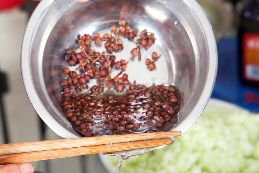 2、接下來要給肉餡去腥,去腥的話最好別用料酒,試試換成花椒水效果會更好,還不會有怪味。倒入小半碗花椒水以後,開始充分的攪打,直至讓肉餡和花椒水完全融合,接下來進行調味。