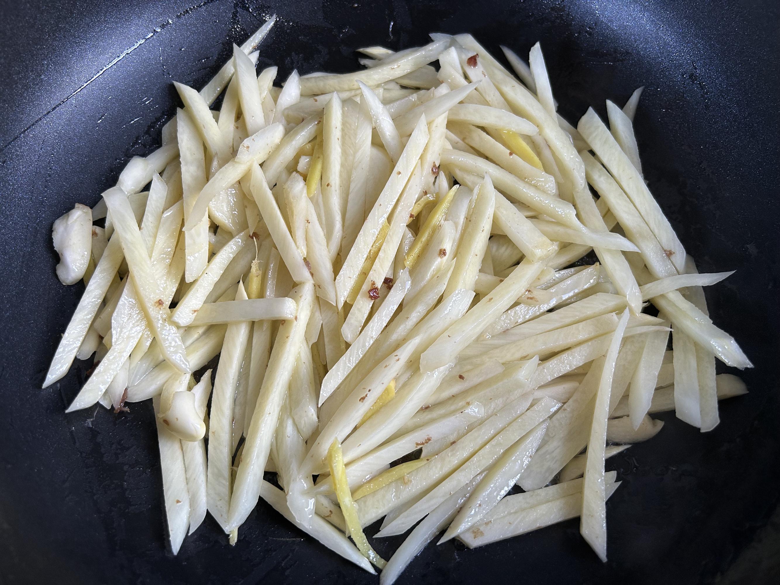 鍋裏重新放油,放入薑絲和大蒜翻炒出香味,加入焯過水的茭白翻炒均勻。