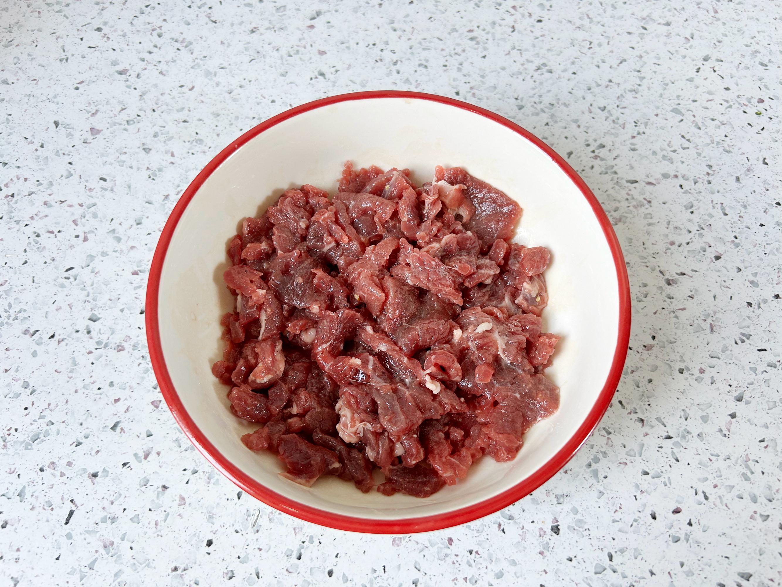 牛肉切成薄片,加入玉米澱粉和食用油翻拌均勻,醃製10分鐘。如果不喜歡喫牛肉,可以換成豬肉。