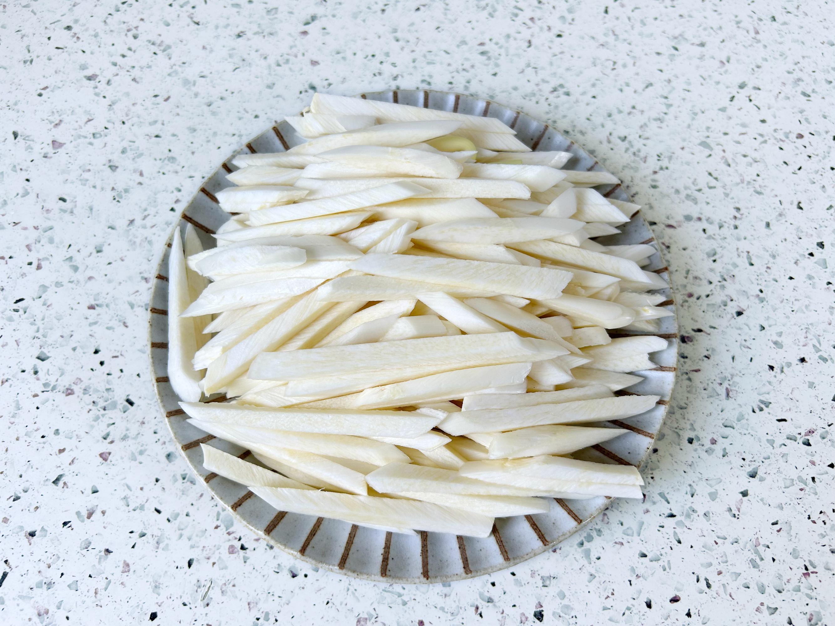茭白剝掉外皮,清洗乾淨,切成細絲備用。