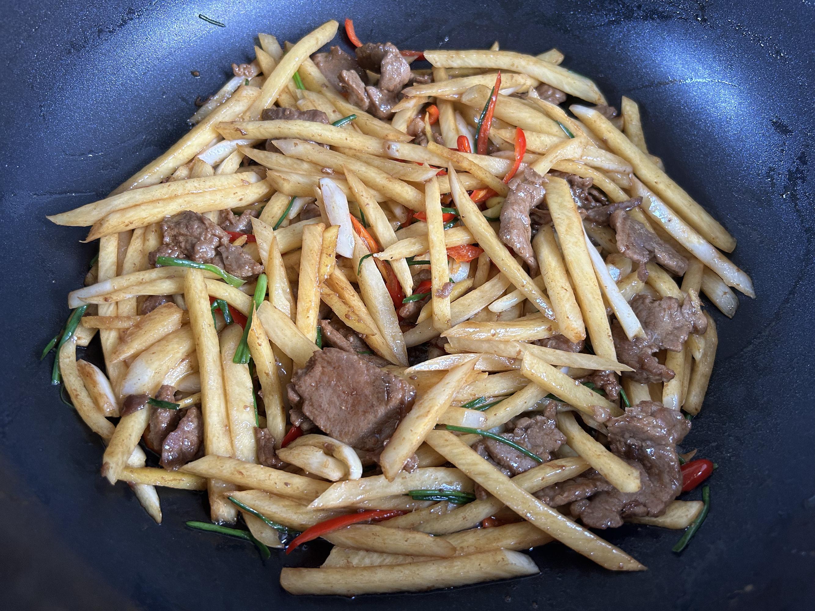 加入老抽翻炒上色,加入炒熟的牛肉翻炒均勻,加入適量的鹽調味。最後加入紅辣椒絲和香蔥段翻炒到斷生,一道營養好喫的茭白炒牛肉就做好了。