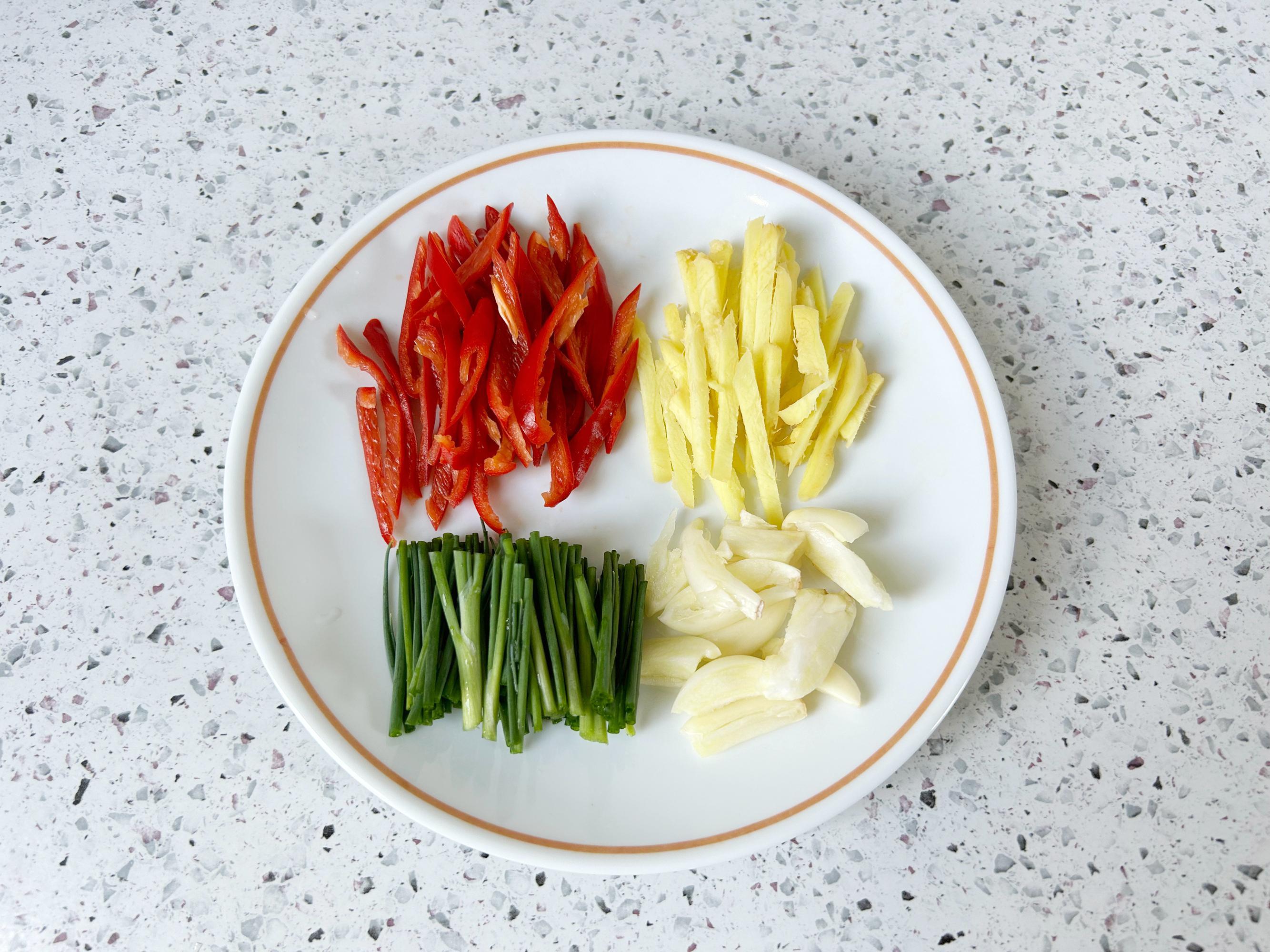 大蒜拍扁去皮,生薑去皮切絲,紅辣椒對半切開,去籽後切成絲,香蔥只要葉子部分,切成長段。
