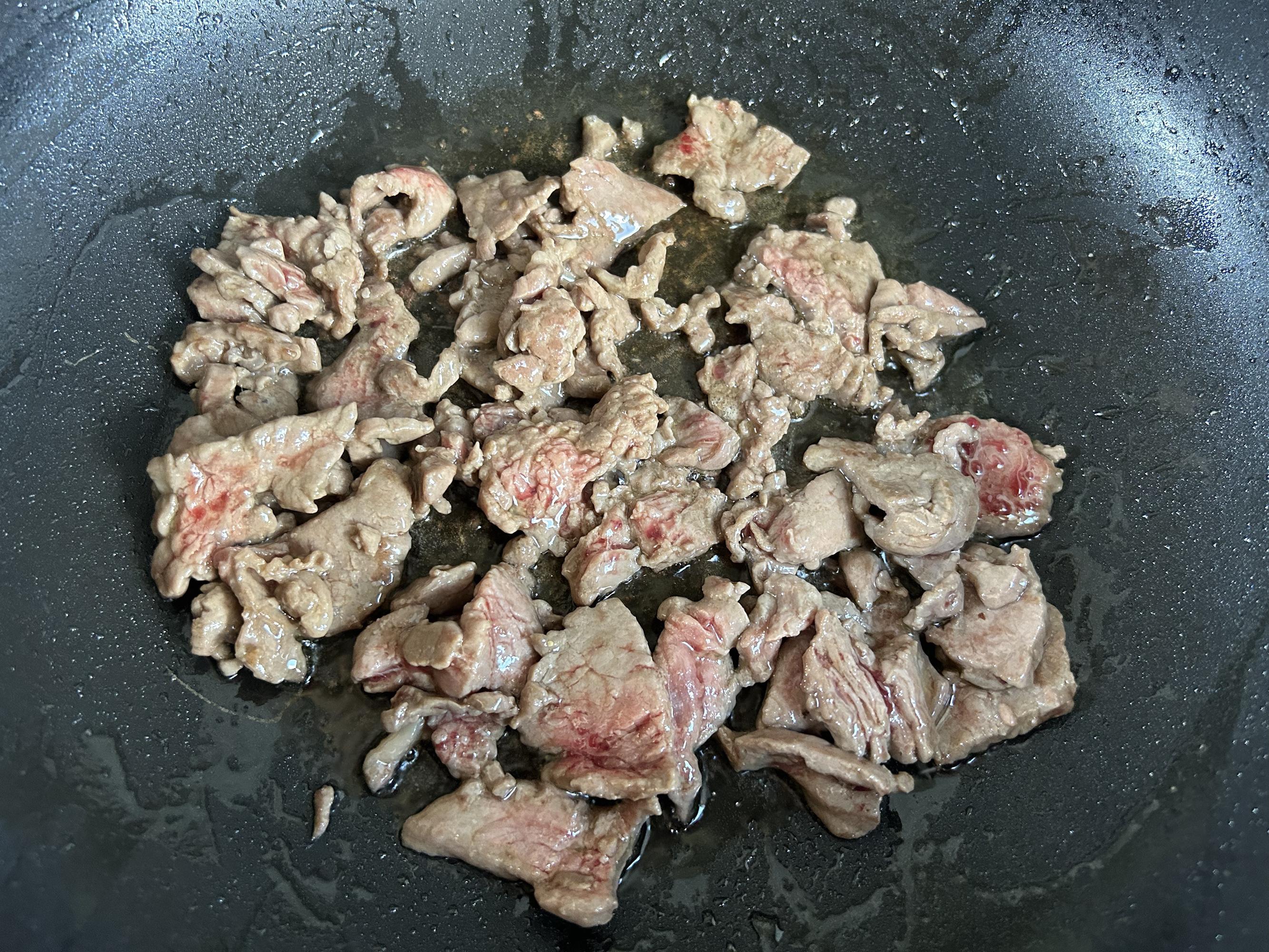 熱鍋放油,放入醃好的牛肉,翻炒熟透,盛出來備用。