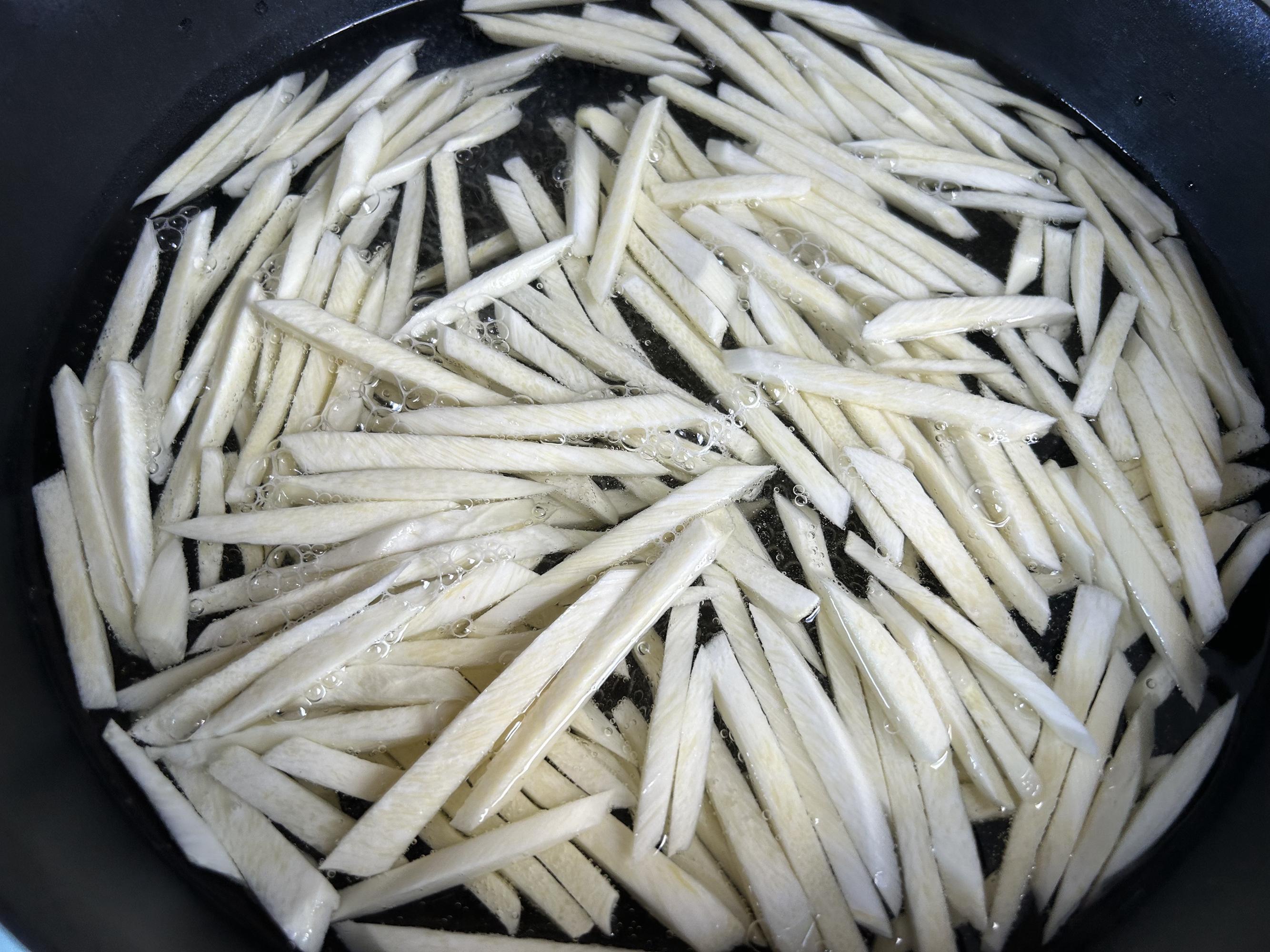 燒一鍋熱開水,放入茭白焯水煮2分鐘,撈出來過涼水,這樣可以去除茭白中的草酸。