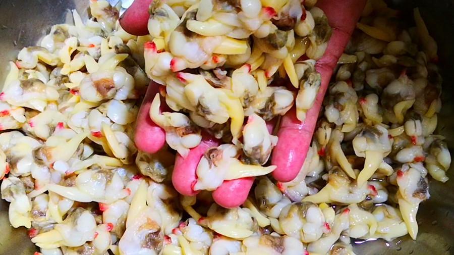 1.蛤蜊先去一下沙,買時可以挑這種已經處理好的蛤蜊肉買,如果花蛤去沙不乾淨是會很影響口感的。將花蛤肉多衝洗幾遍後切成小塊備用。