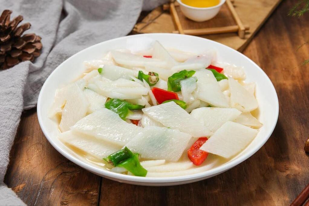 1、首先把山藥削皮,最好在流動的清水下削皮,削皮以後將其切成片狀備用,然後再把青辣椒切塊,胡蘿蔔切片。