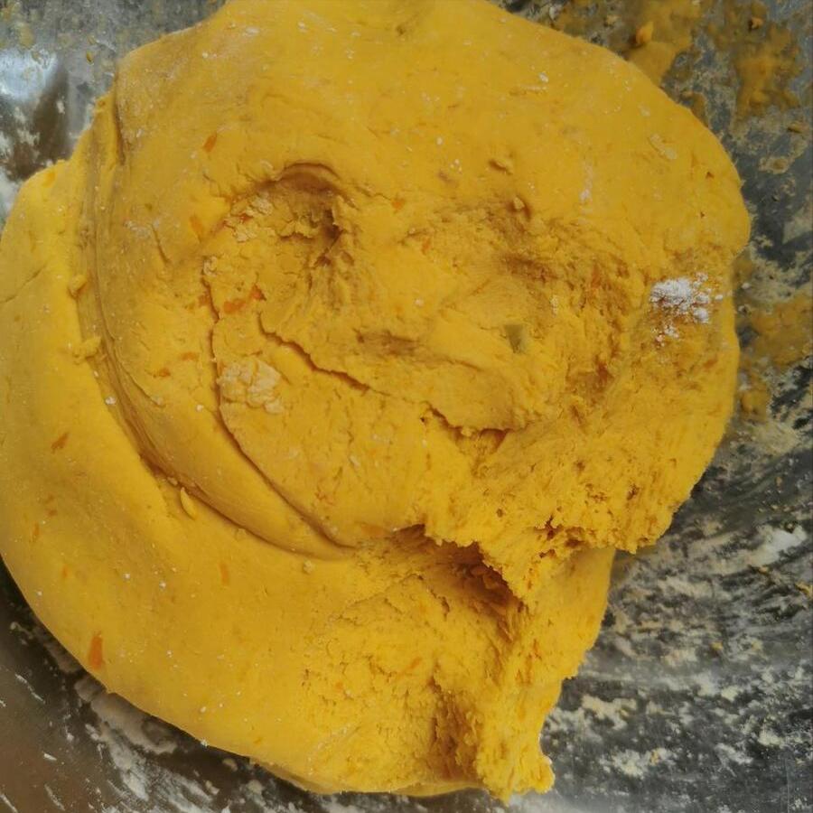 3、這個麪糊裏面是不需要加水的,因爲南瓜本身就出水,再加水的話容易變得黏糊糊的,後續就不好煎了。隨後戴上一次性手套,下手將其揉成一個光滑的麪糰,然後把麪糰分成數等份,每一份都將其揉圓按扁,然後再在表面裹上一圈白芝麻。