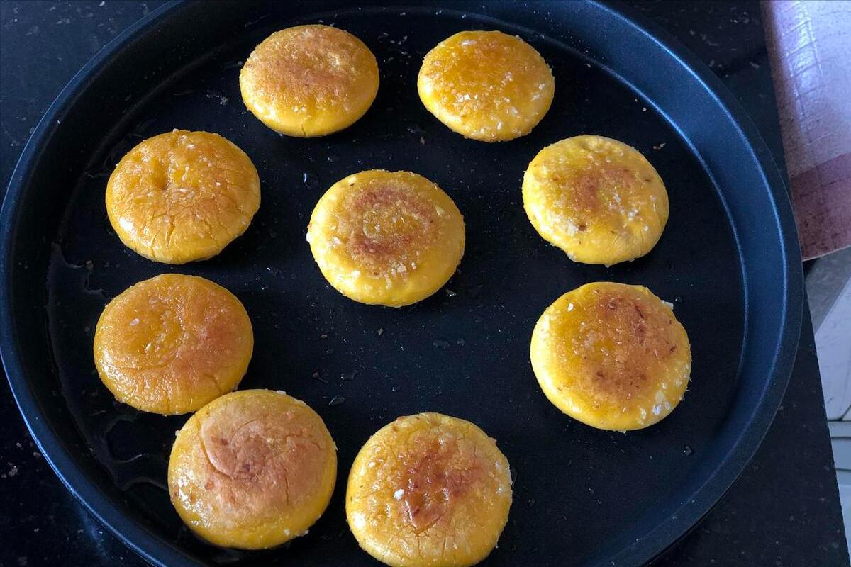 4、隨後準備好不粘鍋,可以刷一層薄薄的油,也可以不放油,然後將南瓜餅放進去煎,一面煎好後再來煎另一面,頻繁翻面,直至煎到金黃色之後,就可以出鍋開喫啦,軟糯香甜,大人孩子都愛不釋手。