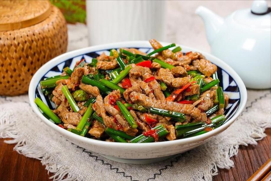 食材:韭菜薹、裏脊肉、鹽、白胡椒粉、雞精、料酒、生抽、澱粉、食用油