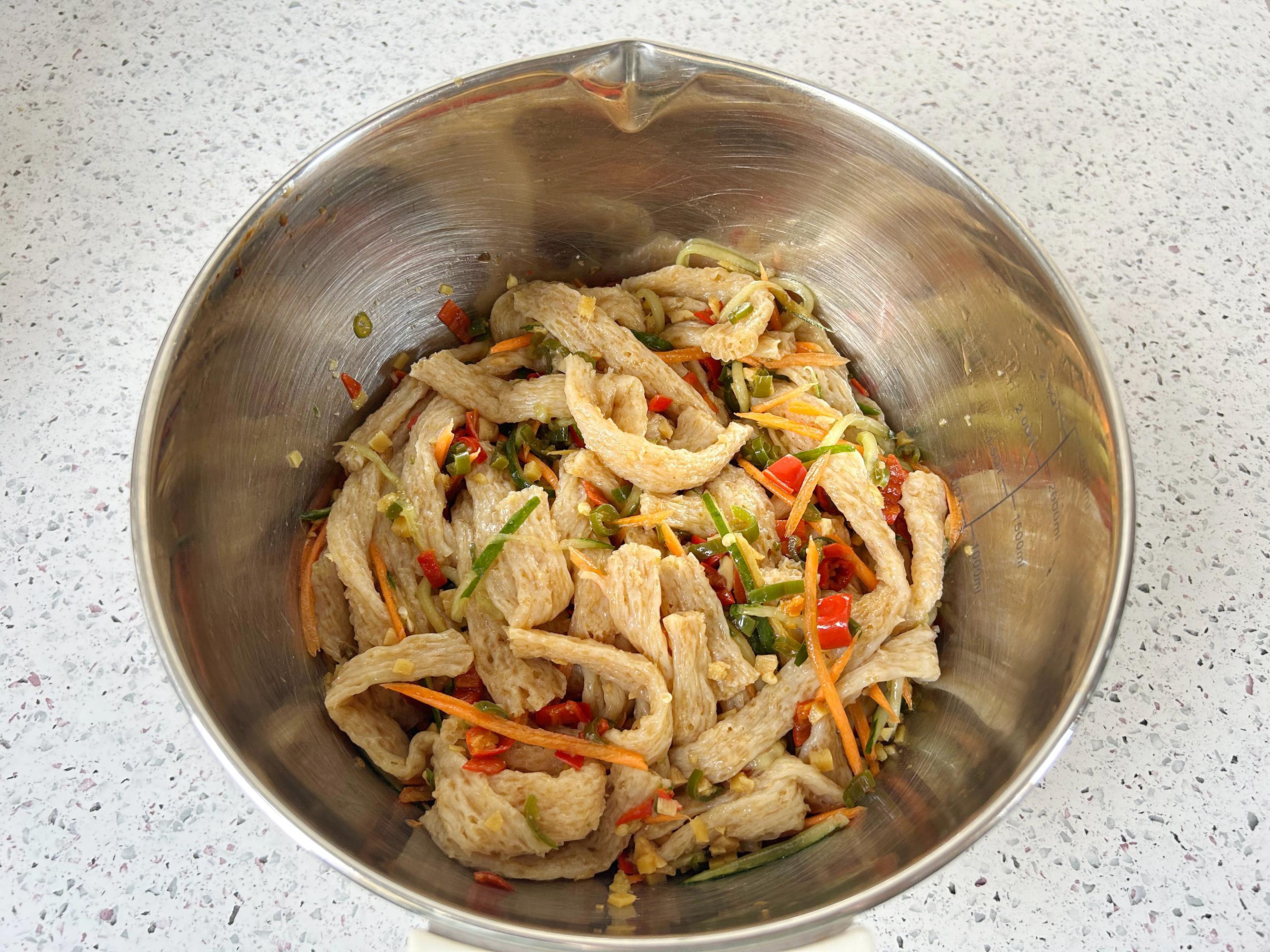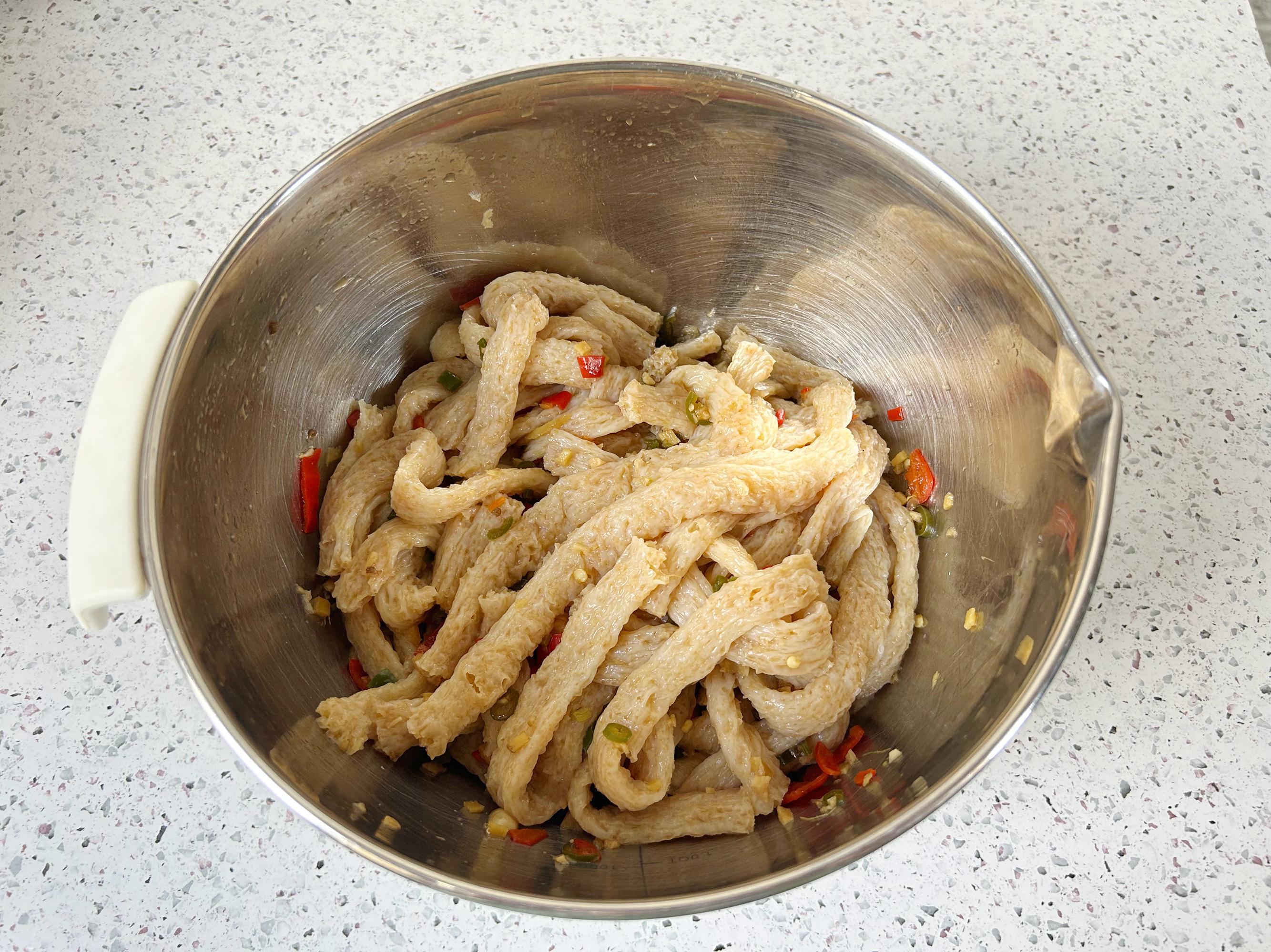 這兩天整理儲物箱,翻出來一袋牛筋面,是之前打算給孩子做辣條買的,一直沒有開封。考慮到孩子最近有些上火,那就換種做法吧。正好還有昨天蒸魚沒用完的剁椒調味醬汁,用它做涼拌牛筋面,應該也不錯。