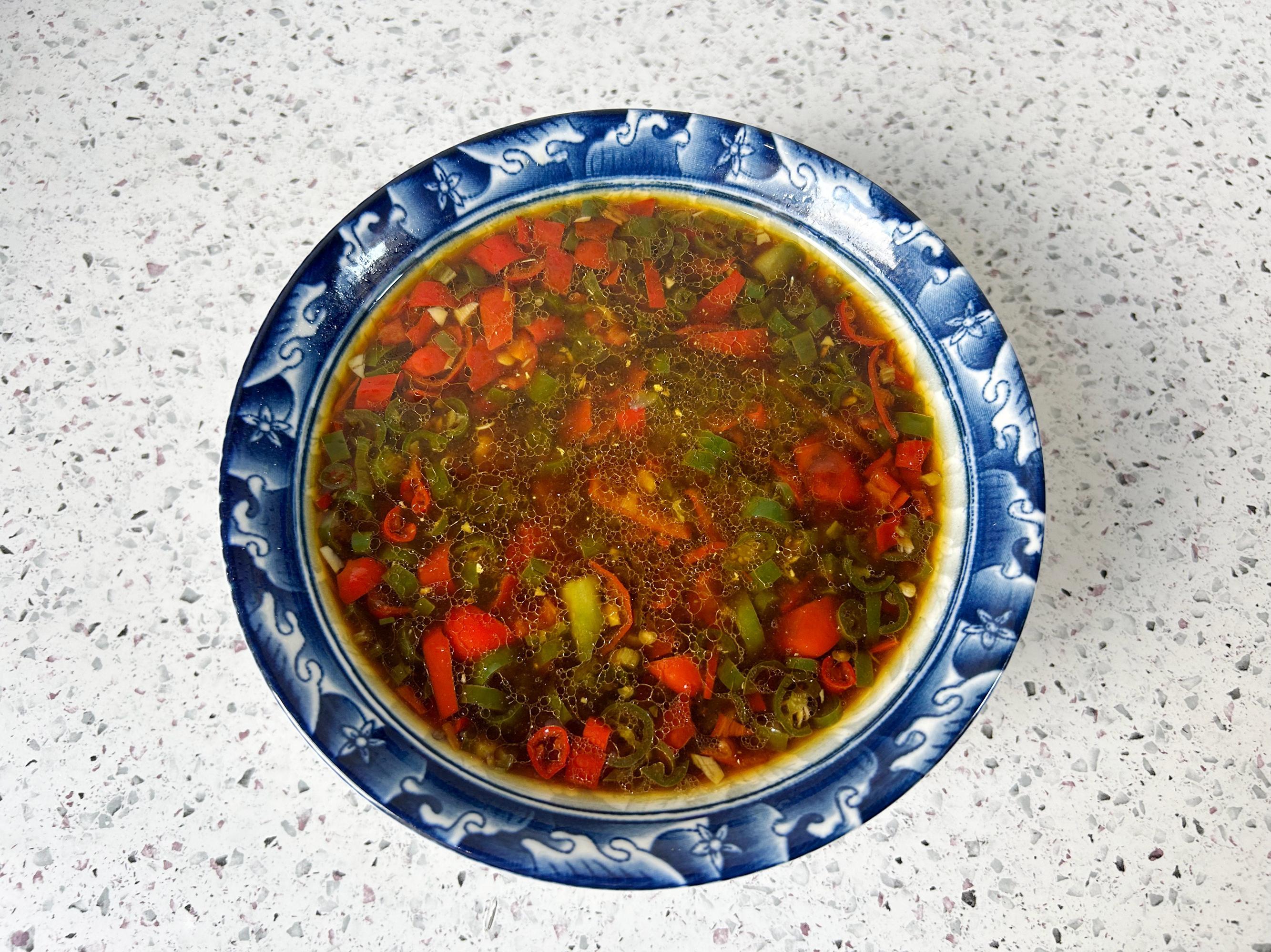我用的涼拌汁是前一天做菜剩下的。如果是現做調味汁,把生薑去皮切顆粒、大蒜拍扁去皮切顆粒,線椒切顆粒,紅辣椒切小段,熱鍋放鹽,放入姜蒜和辣椒翻炒出香味,加一碗水煮開,加蒸魚豉油和蠔油調味,再次煮開。