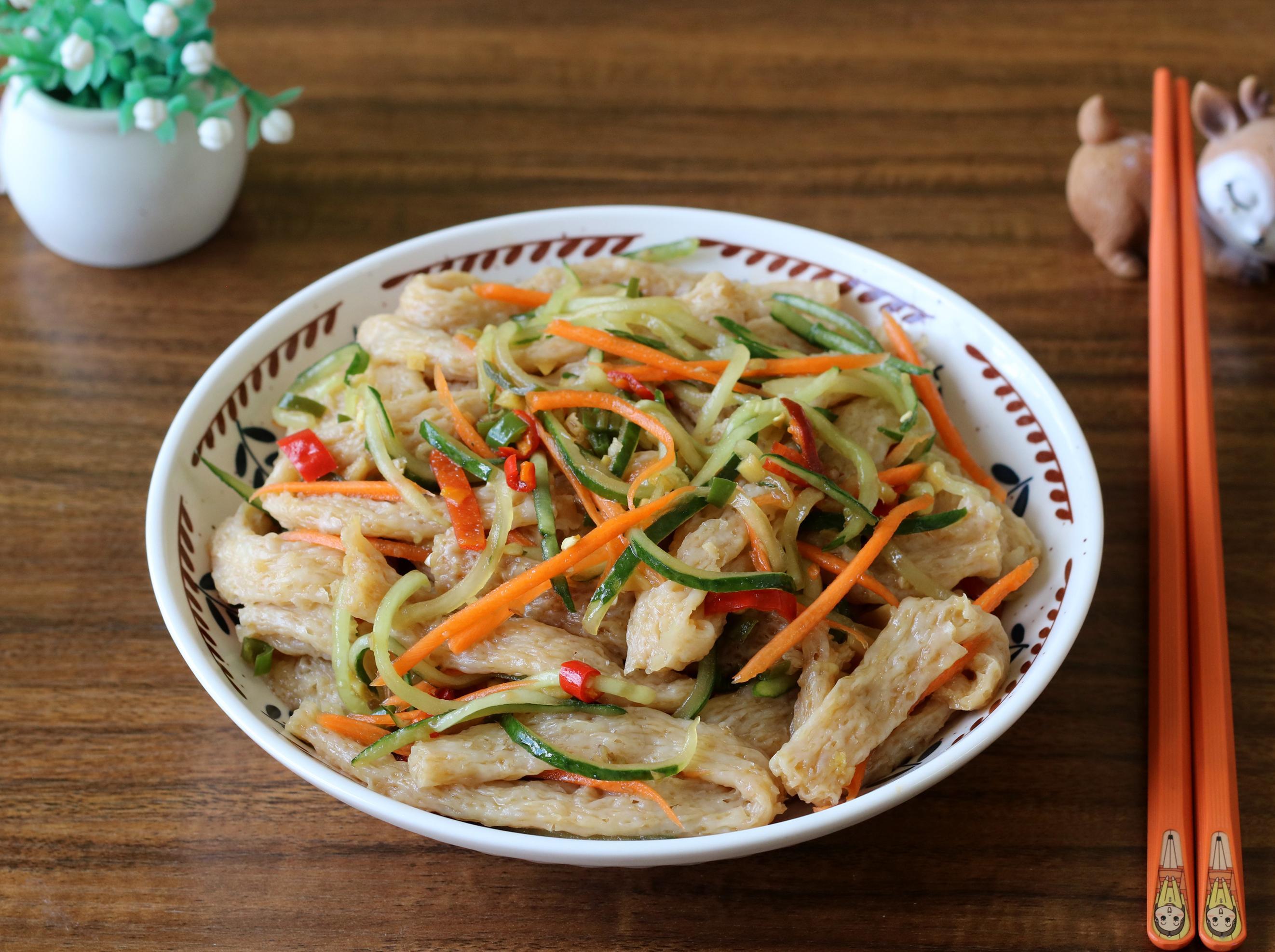 加入胡蘿蔔絲和黃瓜絲,再次翻拌均勻,一道營養好喫又省事的涼拌牛筋面就做好了。這道涼拌牛筋面,最好是現喫現做,時間長了口感反而不好。