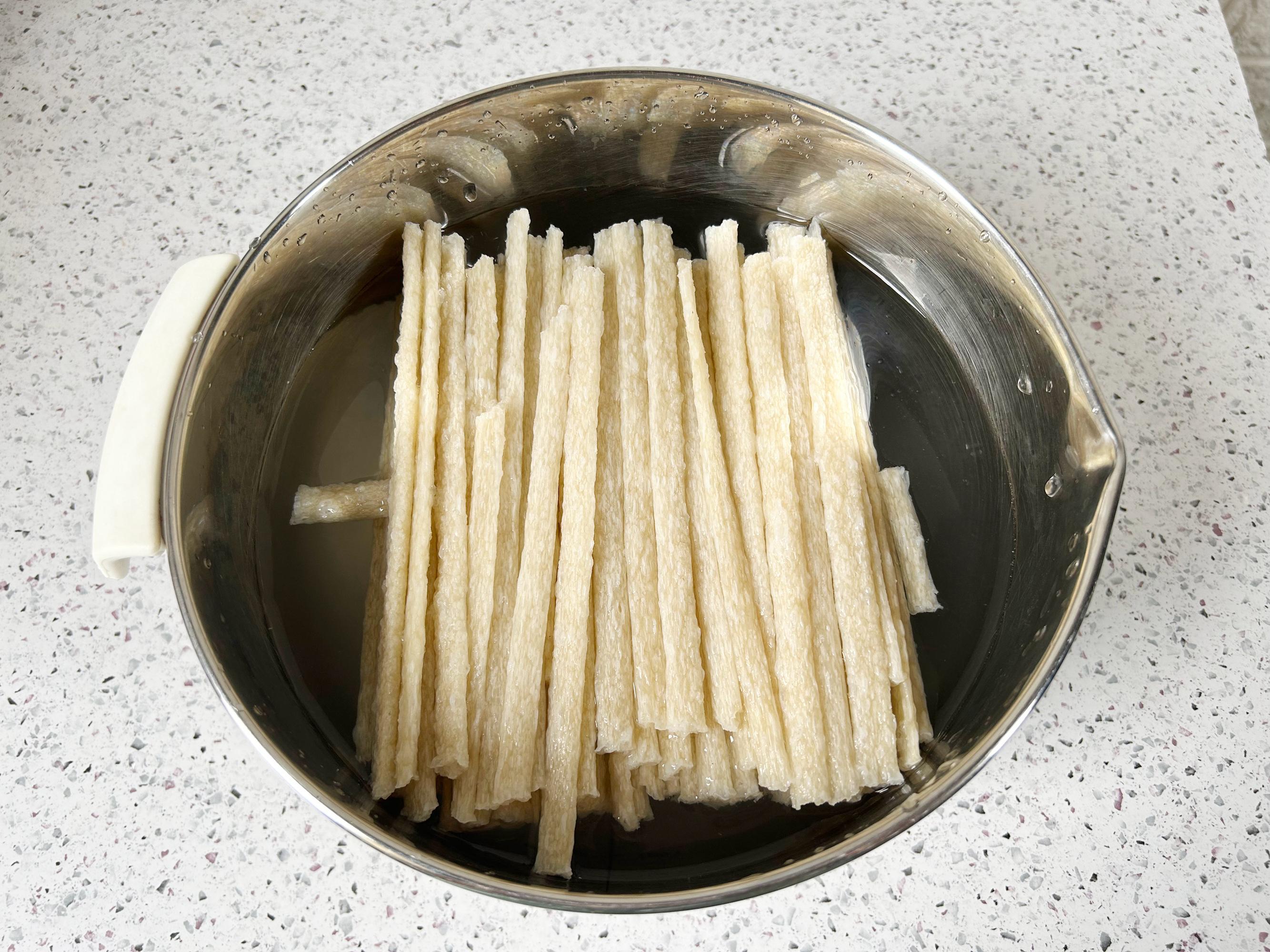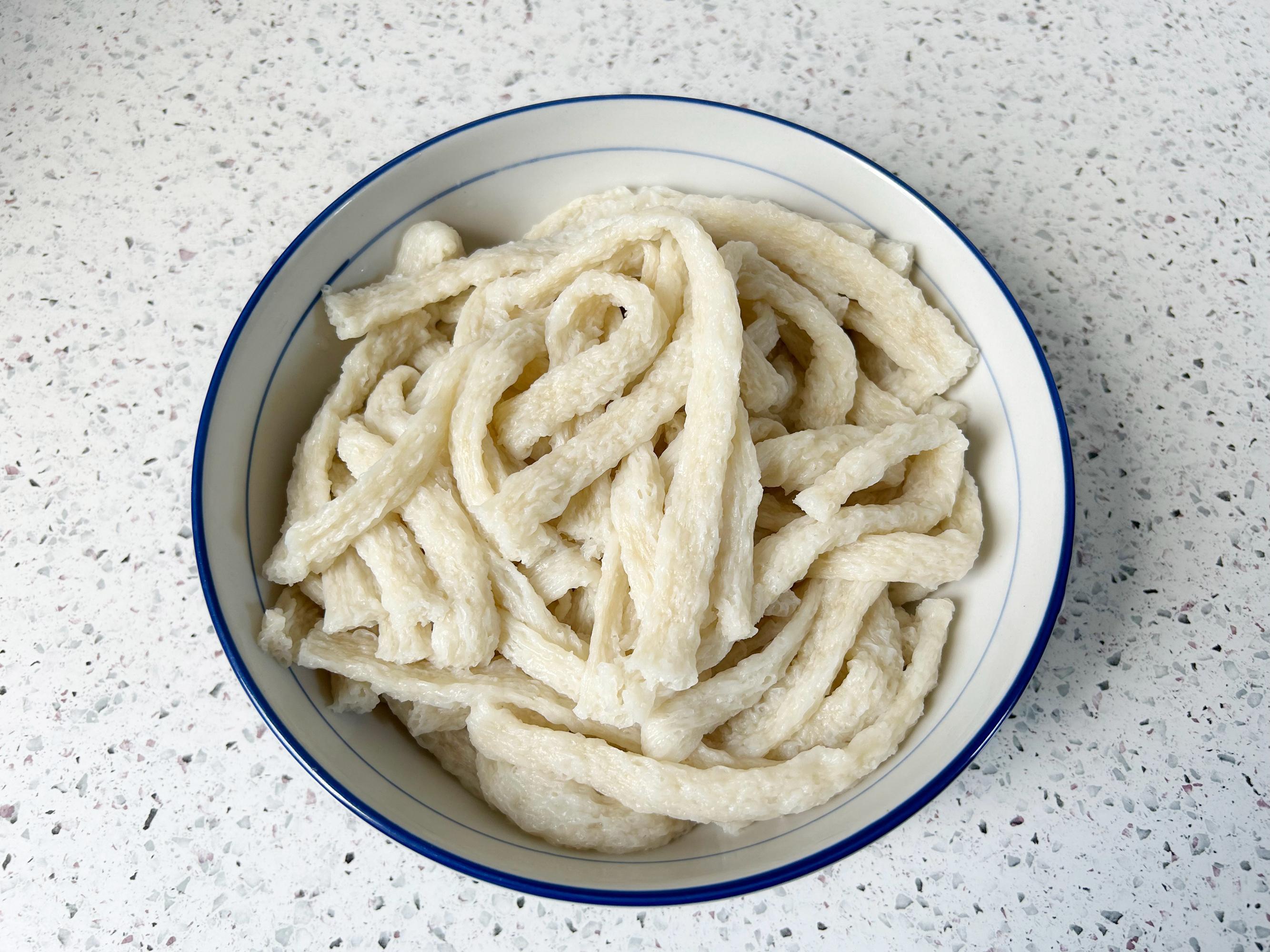 做涼拌牛筋面,有2點要注意,1、泡牛筋面要用冷水,2、浸泡的時間不能太長。