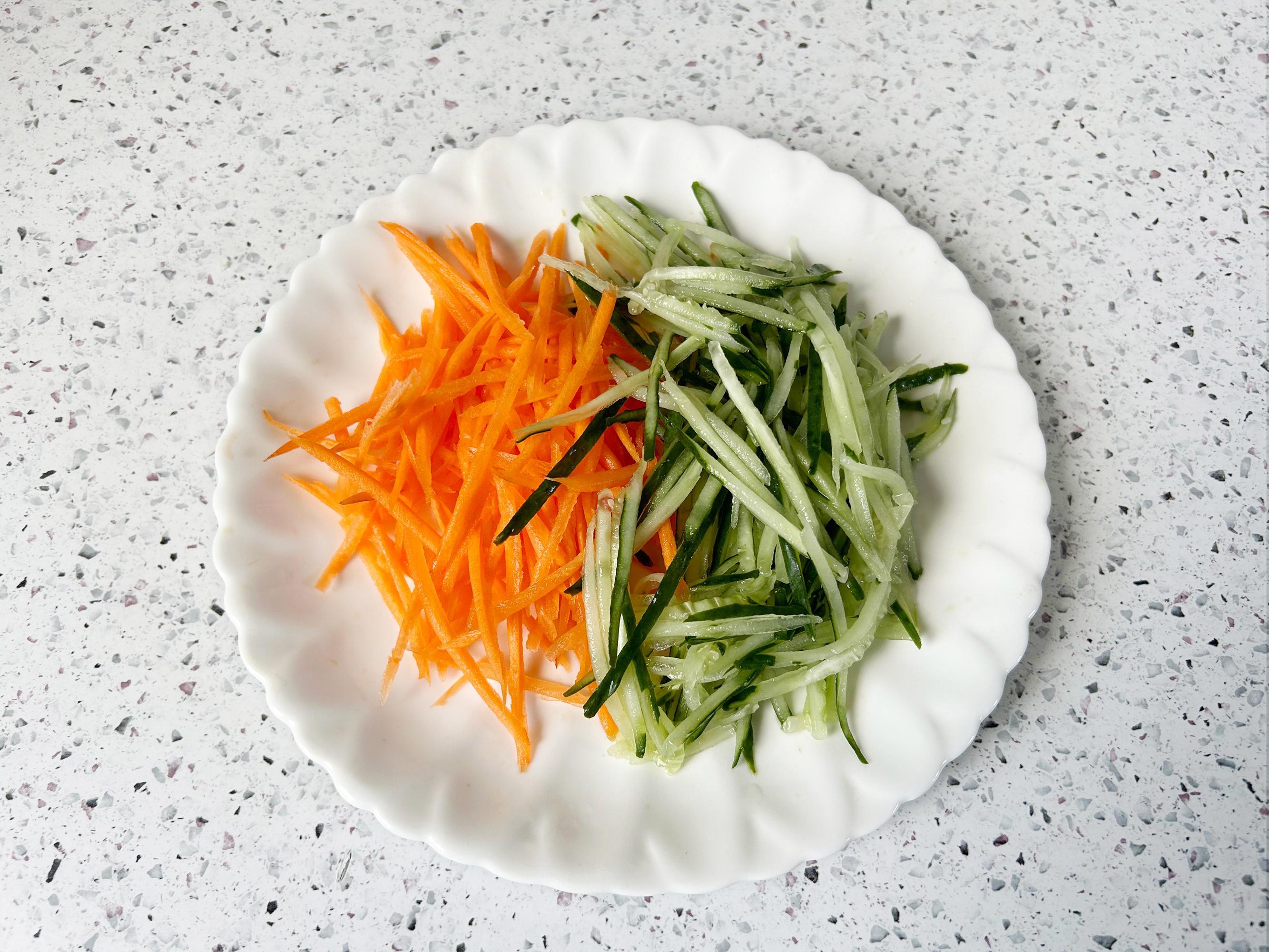 浸泡牛筋面的時候,黃瓜清洗乾淨,刨成絲,把胡蘿蔔去皮刨絲。