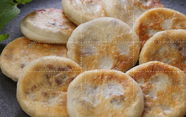 - 平底鍋倒油,倒入麪糊,用鏟子攤平。小火慢煎,直至兩面金黃。