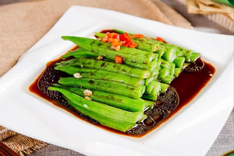 食材:秋葵、幹辣椒、大蒜、生抽、醋、鹽、白糖、雞精、食用油、香油