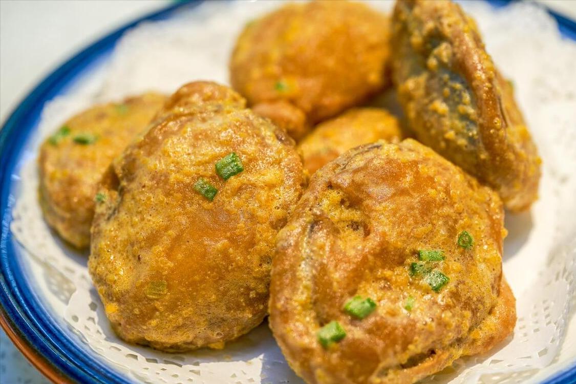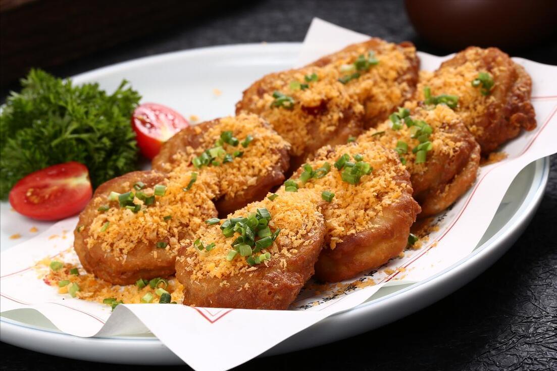 2、接下來將肉餡夾在藕片中,隨後準備一個小盆,加上2大勺麪粉、1大勺澱粉、3g泡打粉,再用啤酒來調糊,攪拌均勻後把藕盒放進去。起鍋燒油,燒熱把藕盒下進去開始炸,炸到金黃撈出來開喫!