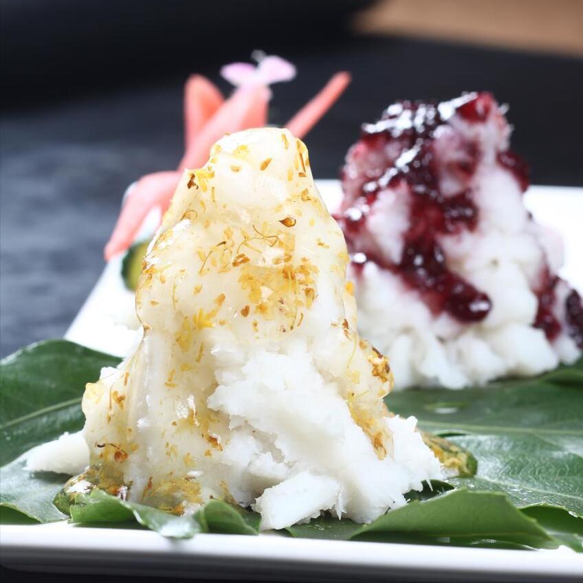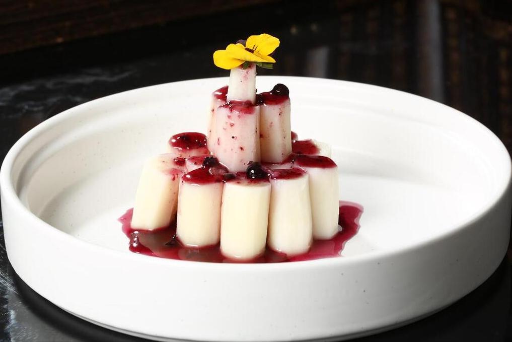 山藥削皮後上鍋蒸,蒸熟了以後放在碗裏壓一下,壓成山藥泥之後,再把白糖加進去,繼續充分攪拌均勻。用裱花袋把山藥泥裝進去,擠在碗裏擠成好看的樣子,然後把藍莓醬用清水化開,澆在山藥泥上,搞定!