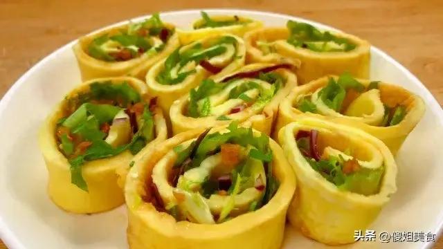 3. 組合卷菜:將煎好的雞蛋餅平鋪在案板上,先鋪上一層紫甘藍絲,再放上一層苦菊。最後,將雞蛋餅從一端捲起,捲成緊實的蔬菜卷。最後把卷好的蔬菜卷用菜刀切成小塊,有序的擺放在盤中,喫的時候比較省事。好喫的雞蛋蔬菜卷就做好了,營養美味,色香味俱全,大人孩子都搶着喫!