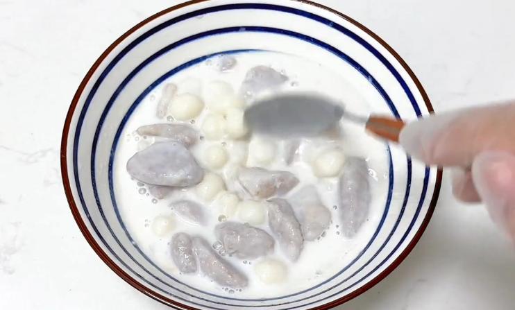 - 鍋中加水煮開,放入芋頭、紫薯繼續大火煮開。水開後,加入小丸子和適量的冰糖,煮至浮起即可。最後加入適量的純牛奶,大火再煮一分鐘,即可盛出食用。