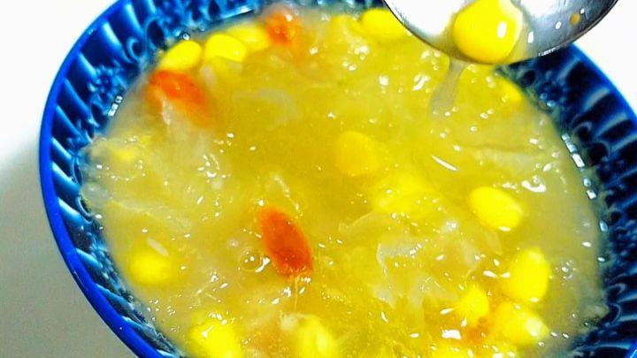 食材:銀耳 1 朵、甜玉米粒 100 克、糯米粉 50 克、冰糖適量、水適量