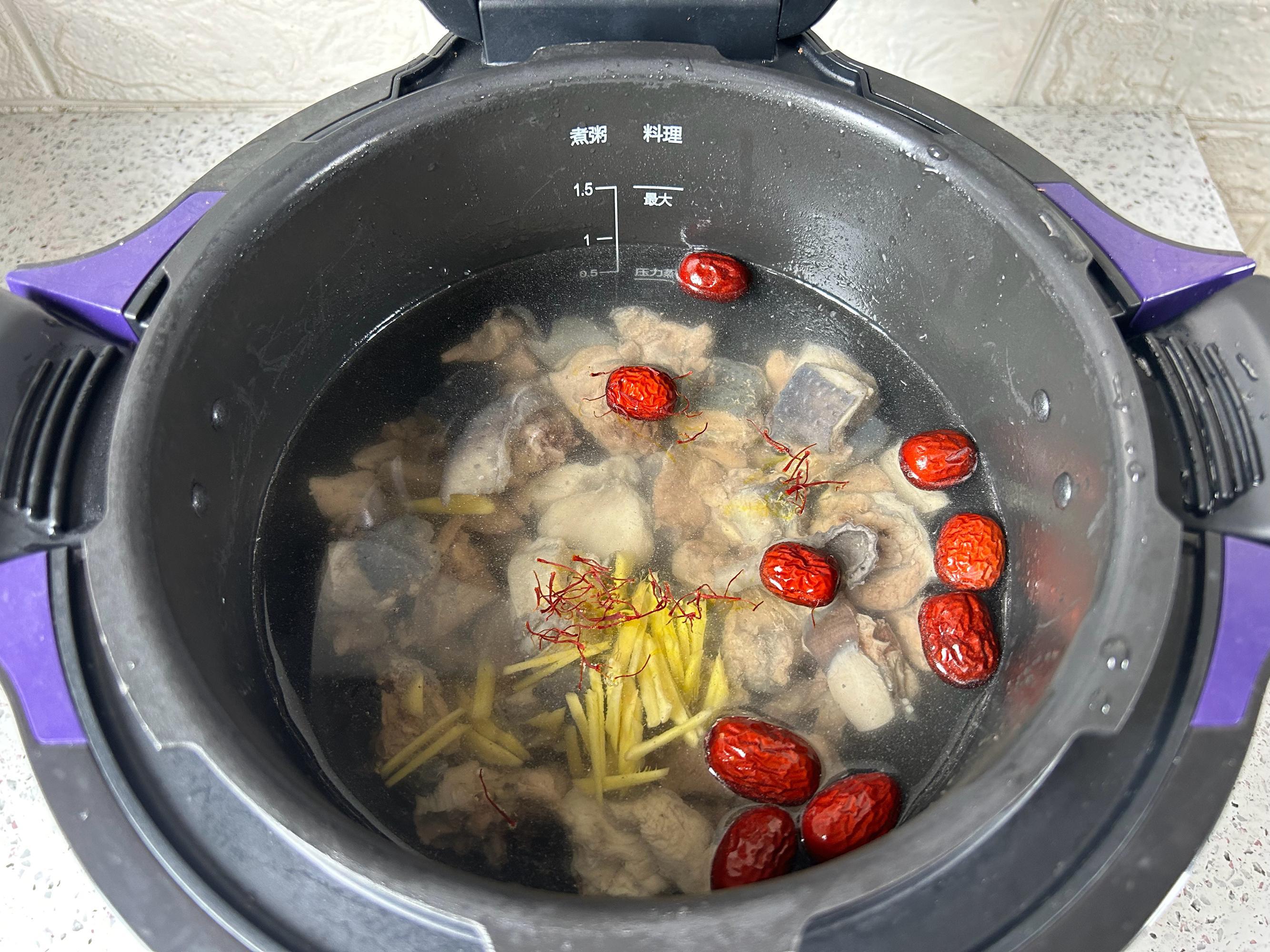 焯過水的烏雞肉放入電壓力鍋中,加適量的水,放入薑絲、紅棗和藏紅花,選擇電飯煲的煲湯程序,時間20-25分鐘。