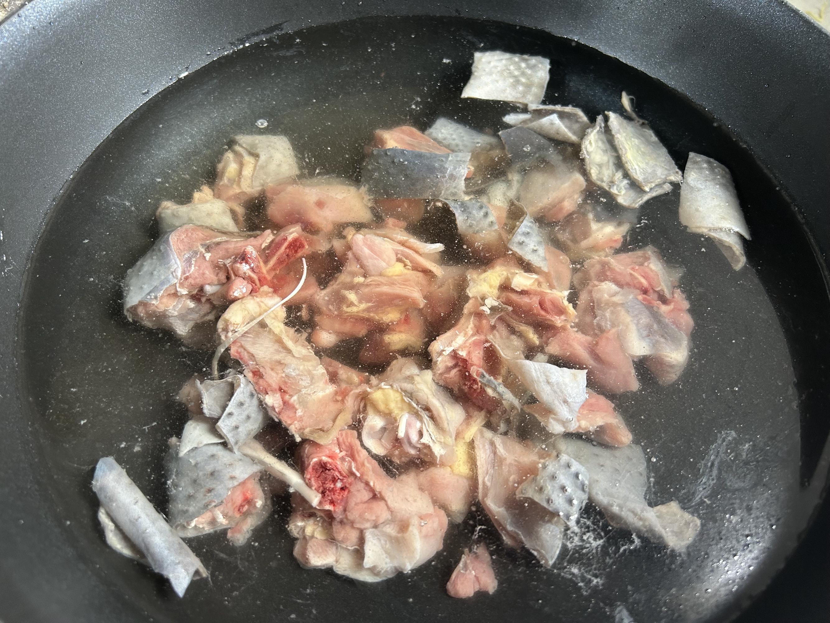 烏雞肉放入鍋裏,加足量的水,加入2大勺料酒,中火加熱,煮開後再煮5分鐘,撈出來清洗乾淨浮沫。