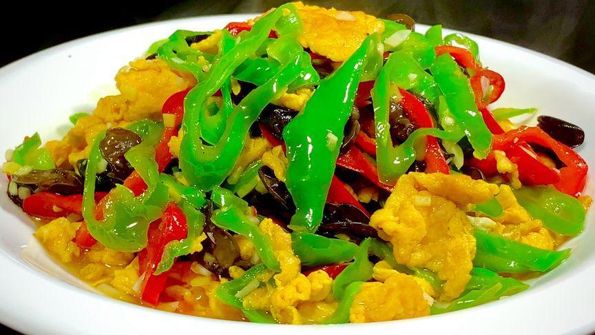 2、鍋中倒油,油熱後倒入雞蛋液,炒熟盛出。鍋中再倒少許油,放入蔥花爆香。加入黑木耳、辣椒翻炒均勻。倒入炒好的雞蛋,加適量鹽和生抽調味,翻炒均勻即可。