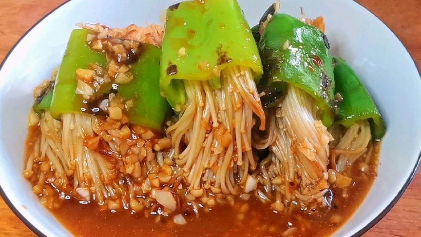3、平底鍋熱油,放入青椒金針菇,小火慢煎。待青椒煎出虎皮後翻面,繼續煎至另一面也呈虎皮狀。倒入醬汁,讓青椒金針菇都裹滿醬汁,大火收汁即可。