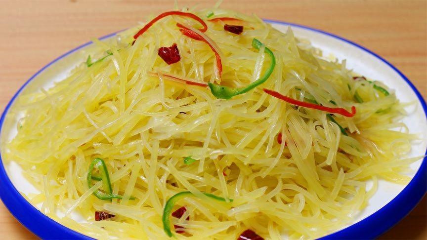 2、鍋中倒油,油熱後放入蒜末爆香。倒入土豆絲翻炒至斷生。加入適量的醋、鹽和生抽調味,繼續翻炒均勻即可出鍋。
